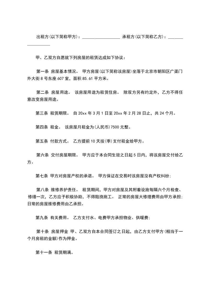 甲、乙双方通过友好协商,就房屋租赁事宜达成协议如下: