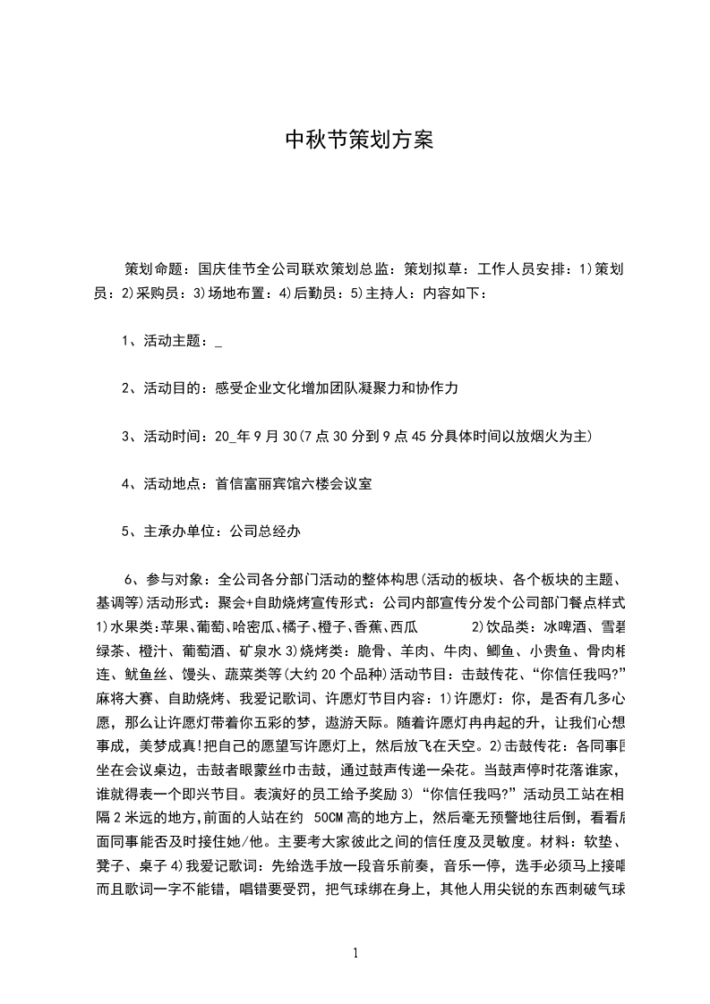 6、参与对象:全公司各分部门活动的整体构思(活动的板块、各个板块的主题、基调等)活动形式:聚会+自助烧烤宣传形式:公司内部宣传分发个公司部门餐点样式1)水果类:苹果、葡萄、哈密瓜、橘子、橙子、香蕉、西瓜2)饮品类:冰啤酒、雪碧、绿茶、橙汁、葡萄酒、矿泉水3)烧烤类:脆骨、羊肉、牛肉、鲫鱼、小贵鱼、骨肉相连、鱿鱼丝、馒头、蔬菜类等(大约20个品种)活动节目:击鼓传花、“你信任我吗?”、麻将大赛、自助烧烤、我爱记歌词、许愿灯节目内容:1)许愿灯:你,是否有几多心愿,那么让许愿灯带着你五彩的梦,遨游天际。随着许愿灯冉冉起的升,让我们心想事成,美梦成真!把自己的愿望写许愿灯上,然后放飞在天空。2)击鼓传花:各同事围坐在会议桌边,击鼓者眼蒙丝巾击鼓,通过鼓声传递一朵花。当鼓声停时花落谁家,谁就得表一个即兴节目。表演好的员工给予奖励3)“你信任我吗?”活动员工站在相隔2米远的地方,前面的人站在约50CM高的地方上,然后毫无预警地往后倒,看看后面同事能否及时接住她/他。主要考大家彼此之间的信任度及灵敏度。材料:软垫、凳子、桌子4)我爱记歌词:先给选手放一段音乐前奏,音乐一停,选手必须马上接唱,而且歌词一字不能错,唱错要受罚,把气球绑在身上,其他人用尖锐的东西刺破气球。而最后胜出的人将获得精美礼品一份。5)麻将大赛:麻将爱好员工可以在烧烤活动时间内,轮番制和牌对家下场谁保持时间最长谁胡的牌最多,他将活得公司牌王称号。并获得精美礼物活动议程安排: