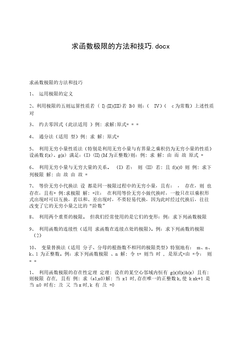 10、 变量替换法(适用 分子、分母的根指数不相同的极限类型)特别地有: m、n、k、l 为正整数。例:求下列函数极限 、n 解: 令 t= 则当 时 , 是原式=由 =令: 则 = =