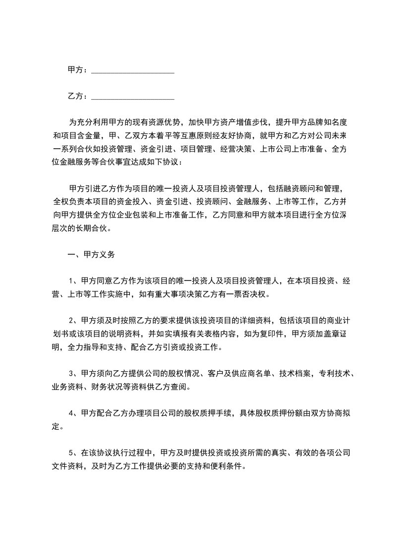 为充分利用甲方的现有资源优势,加快甲方资产增值步伐,提升甲方品牌知名度和项目含金量,甲、乙双方本着平等互惠原则经友好协商,就甲方和乙方对公司未来一系列合伙如投资管理、资金引进、项目管理、经营决策、上市公司上市准备、全方位金融服务等合伙事宜达成如下协议: