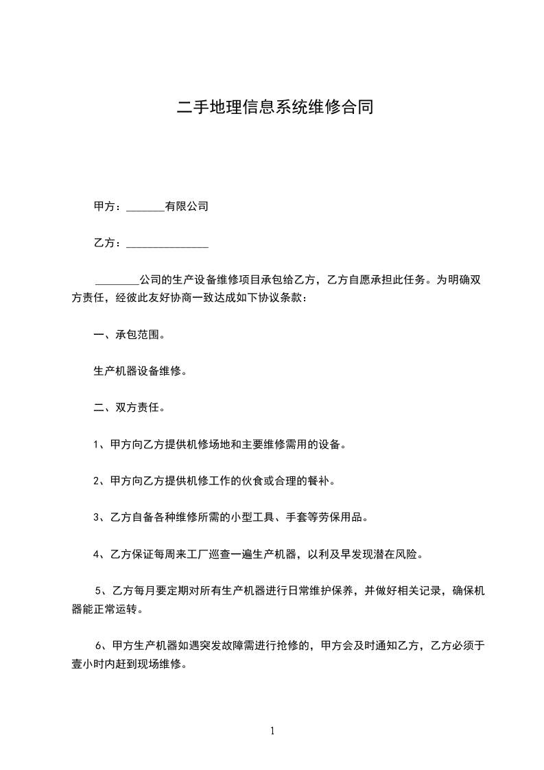 1、甲方向乙方提供机修场地和主要维修需用的设备。