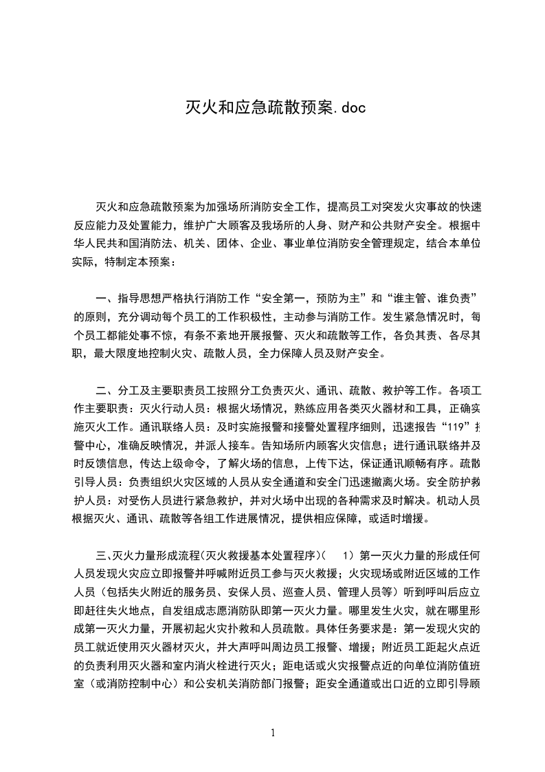 灭火和应急疏散预案为加强场所消防安全工作,提高员工对突发火灾事故的快速反应能力及处置能力,维护广大顾客及我场所的人身、财产和公共财产安全。根据中华人民共和国消防法、机关、团体、企业、事业单位消防安全管理规定,结合本单位实际,特制定本预案:
