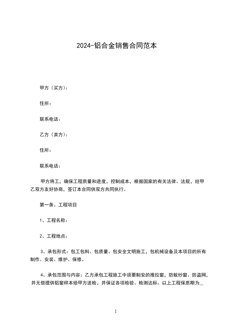 4、承包范围与内容:乙方承包工程施工中须要制安的推拉窗,防蚊纱窗、防盗网,并无偿提供铝窗样本给甲方送检,并保证各项检验、检测达标。以上工程保质期为_______年,因乙方材料不合格或施工工序不当造成质量、安全问题,由乙方承担相关责任。