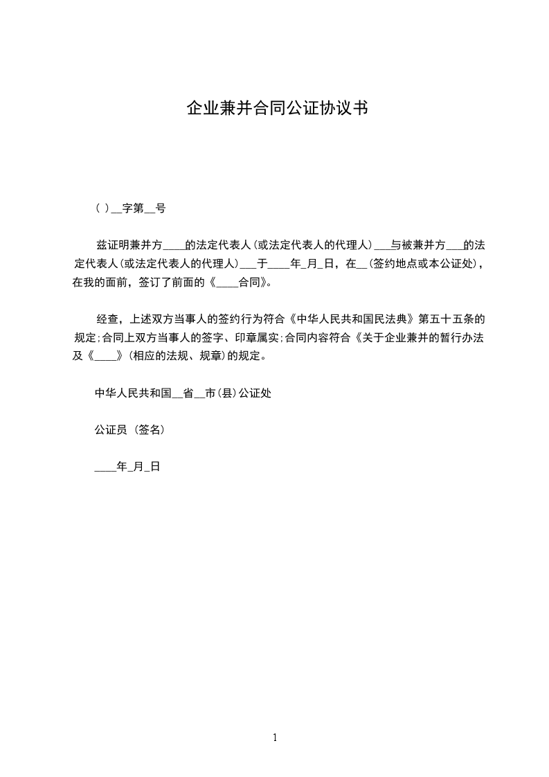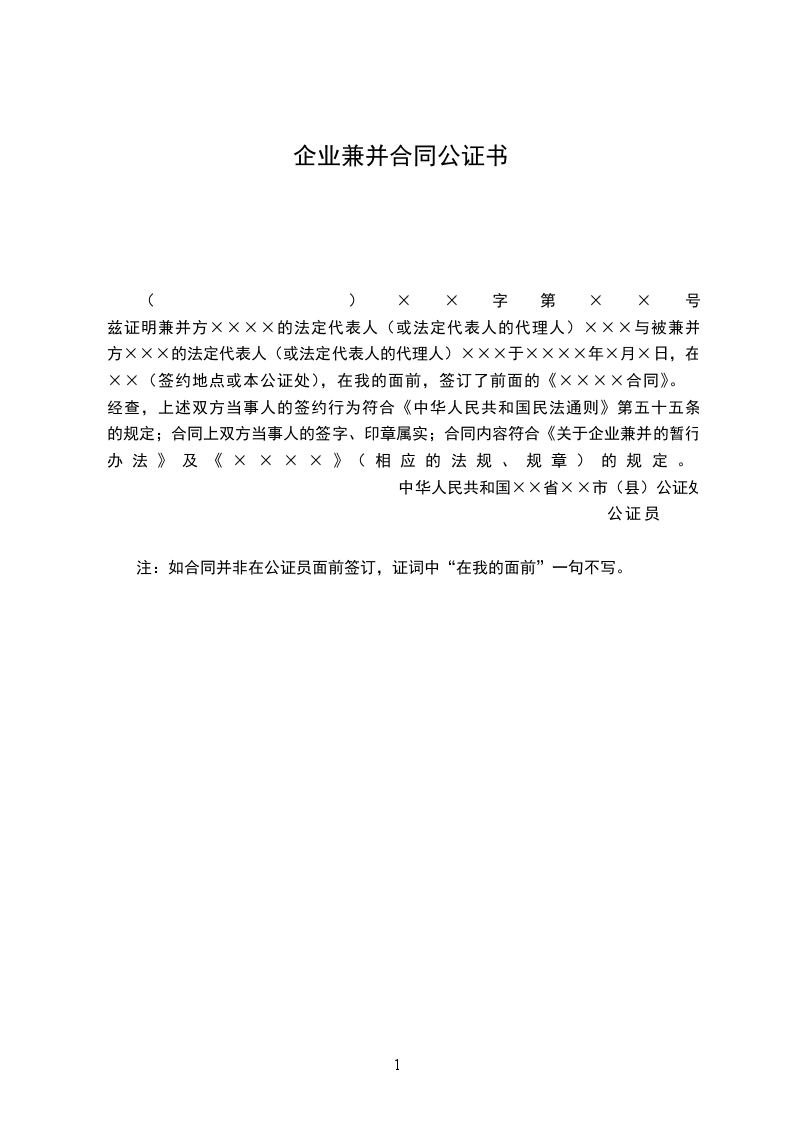 兹证明兼并方××××的法定代表人(或法定代表人的代理人)×××与被兼并方×××的法定代表人(或法定代表人的代理人)×××于××××年×月×日,在××(签约地点或本公证处),在我的面前,签订了前面的《××××合同》。