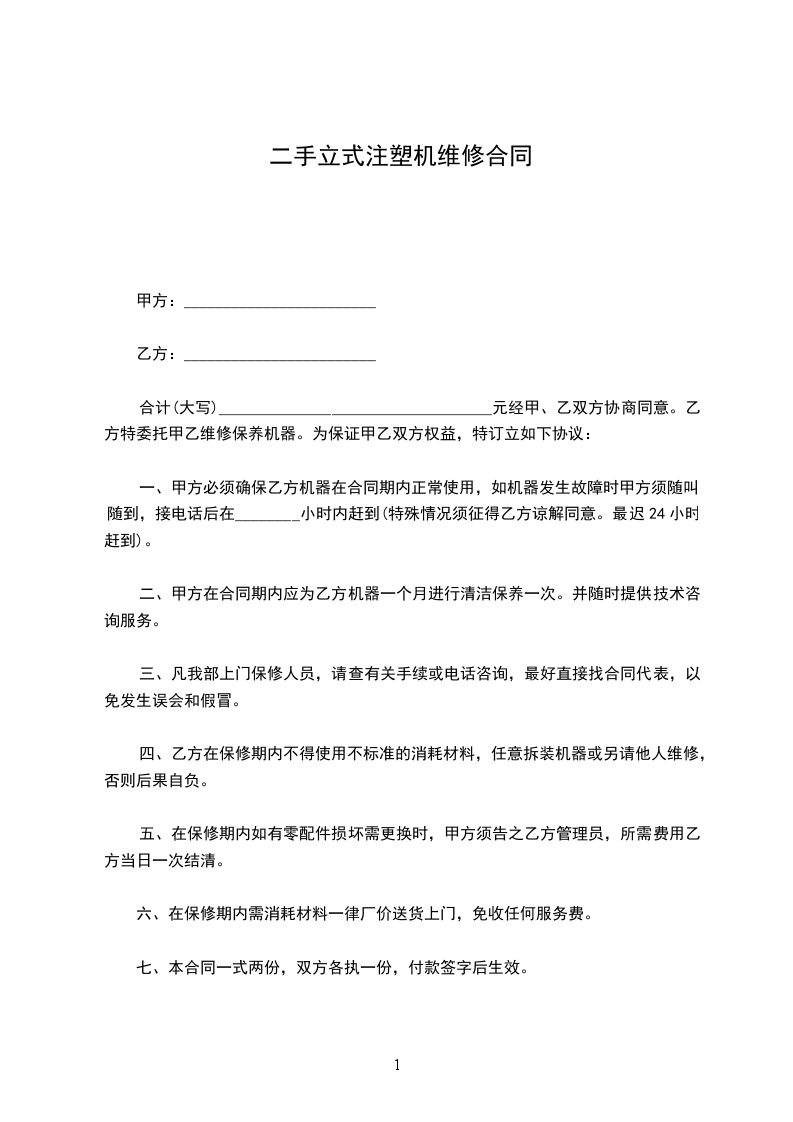 合计(大写)__________________________________元经甲、乙双方协商同意。乙方特委托甲乙维修保养机器。为保证甲乙双方权益,特订立如下协议: