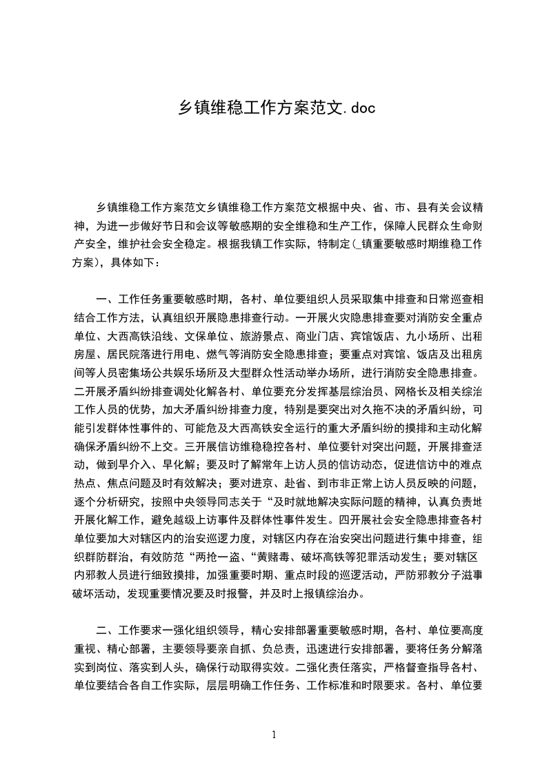 乡镇维稳工作方案范文乡镇维稳工作方案范文根据中央、省、市、县有关会议精神,为进一步做好节日和会议等敏感期的安全维稳和生产工作,保障人民群众生命财产安全,维护社会安全稳定。根据我镇工作实际,特制定(_镇重要敏感时期维稳工作方案),具体如下: