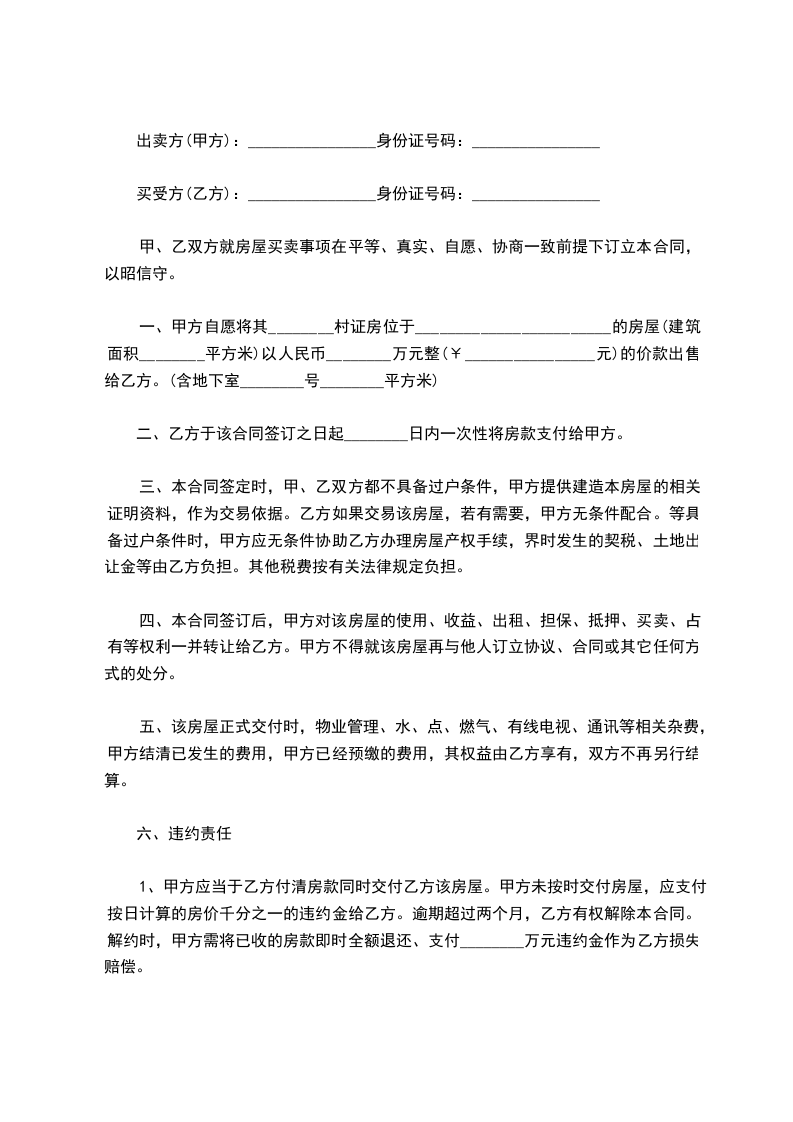 一、甲方自愿将其________村证房位于________________________的房屋(建筑面积________平方米)以人民币________万元整(¥________________元)的价款出售给乙方。(含地下室________号________平方米)