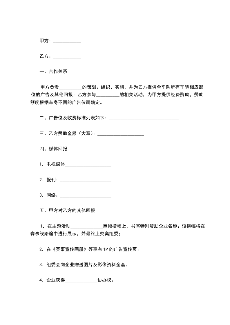甲方负责__________的策划、组织、实施,并为乙方提供全车队所有车辆相应部位的广告及其他回报;乙方参与__________的相关活动,为甲方提供经费赞助,赞助额度根据车身不同的广告位而确定。