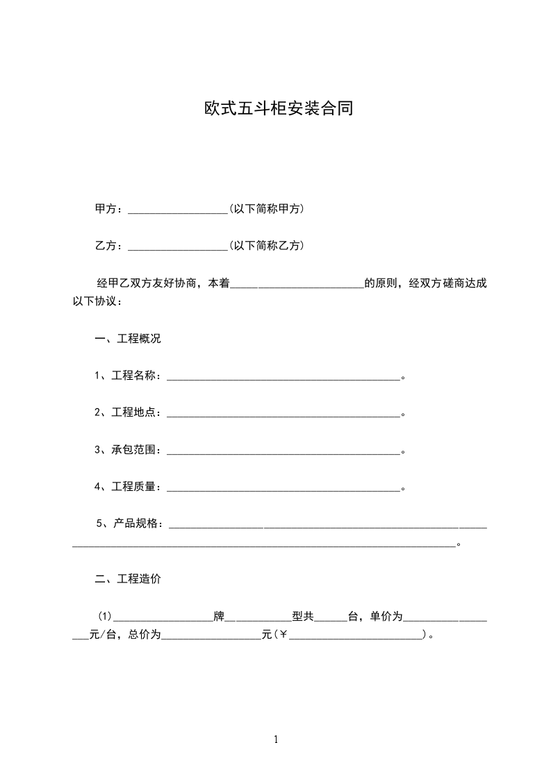 5、工期90天,逾期乙方承担________________________元/天的违约费,如遇雨天等不可抗拒因素,工期顺延。具体安装时间以甲方通知为准。