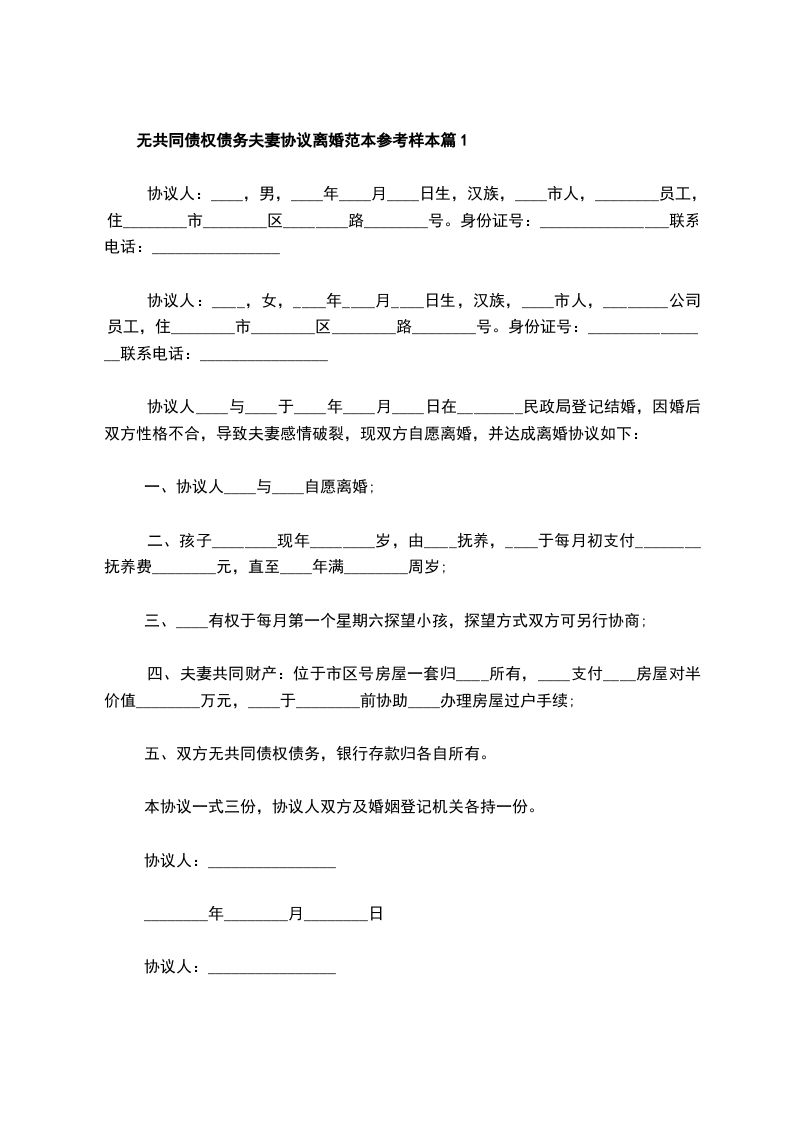 无共同债权债务夫妻协议离婚范本参考样本篇11
