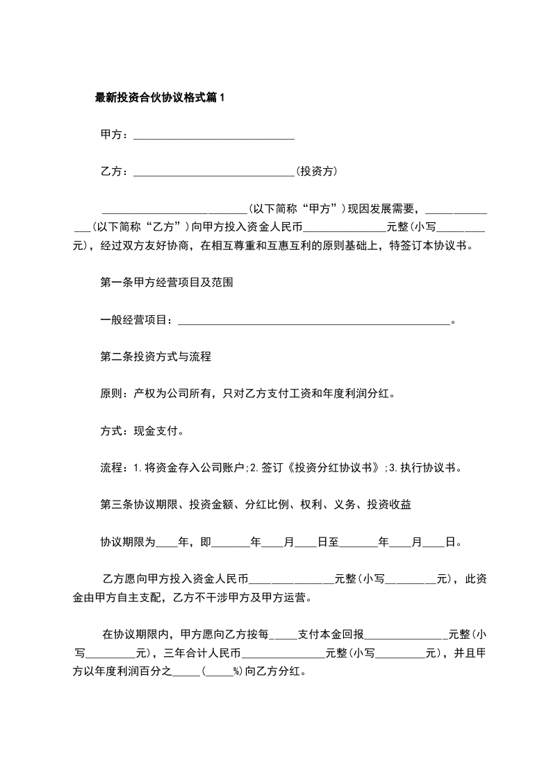 最新投资合伙协议格式篇1