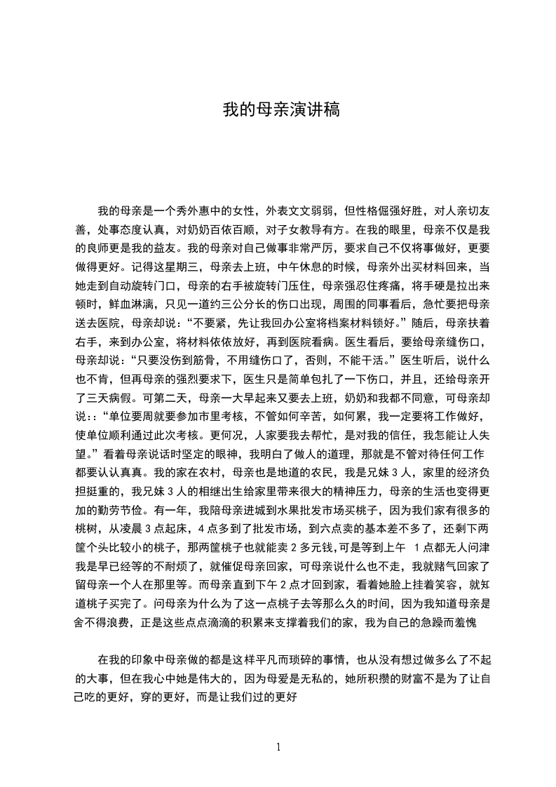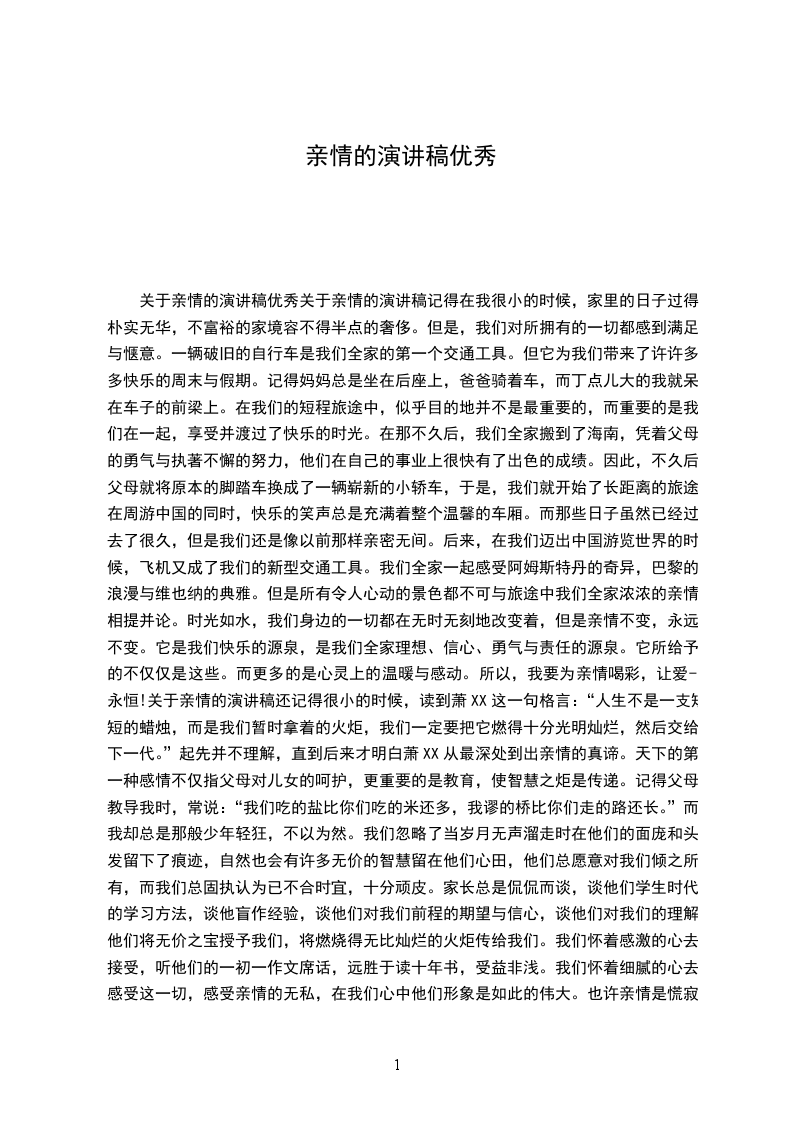 关于亲情的演讲稿优秀关于亲情的演讲稿记得在我很小的时候,家里的日子过得朴实无华,不富裕的家境容不得半点的奢侈。但是,我们对所拥有的一切都感到满足与惬意。一辆破旧的自行车是我们全家的第一个交通工具。但它为我们带来了许许多多快乐的周末与假期。记得妈妈总是坐在后座上,爸爸骑着车,而丁点儿大的我就呆在车子的前梁上。在我们的短程旅途中,似乎目的地并不是最重要的,而重要的是我们在一起,享受并渡过了快乐的时光。在那不久后,我们全家搬到了海南,凭着父母的勇气与执著不懈的努力,他们在自己的事业上很快有了出色的成绩。因此,不久后父母就将原本的脚踏车换成了一辆崭新的小轿车,于是,我们就开始了长距离的旅途,在周游中国的同时,快乐的笑声总是充满着整个温馨的车厢。而那些日子虽然已经过去了很久,但是我们还是像以前那样亲密无间。后来,在我们迈出中国游览世界的时候,飞机又成了我们的新型交通工具。我们全家一起感受阿姆斯特丹的奇异,巴黎的浪漫与维也纳的典雅。但是所有令人心动的景色都不可与旅途中我们全家浓浓的亲情相提并论。时光如水,我们身边的一切都在无时无刻地改变着,但是亲情不变,永远不变。它是我们快乐的源泉,是我们全家理想、信心、勇气与责任的源泉。它所给予的不仅仅是这些。而更多的是心灵上的温暖与感动。所以,我要为亲情喝彩,让爱-永恒!关于亲情的演讲稿还记得很小的时候,读到萧XX这一句格言:“人生不是一支短短的蜡烛,而是我们暂时拿着的火炬,我们一定要把它燃得十分光明灿烂,然后交给下一代。”起先并不理解,直到后来才明白萧XX从最深处到出亲情的真谛。天下的第一种感情不仅指父母对儿女的呵护,更重要的是教育,使智慧之炬是传递。记得父母教导我时,常说:“我们吃的盐比你们吃的米还多,我谬的桥比你们走的路还长。”而我却总是那般少年轻狂,不以为然。我们忽略了当岁月无声溜走时在他们的面庞和头发留下了痕迹,自然也会有许多无价的智慧留在他们心田,他们总愿意对我们倾之所有,而我们总固执认为已不合时宜,十分顽皮。家长总是侃侃而谈,谈他们学生时代的学习方法,谈他盲作经验,谈他们对我们前程的期望与信心,谈他们对我们的理解他们将无价之宝授予我们,将燃烧得无比灿烂的火炬传给我们。我们怀着感激的心去接受,听他们的一初一作文席话,远胜于读十年书,受益非浅。我们怀着细腻的心去感受这一切,感受亲情的无私,在我们心中他们形象是如此的伟大。也许亲情是慌寂沙漠中的绿洲,当你落寞软弱无力,干渴病痛时,看一眼已是满目生辉,心灵得到安慰,于是不会孤独,便会疾步上前,只需一滴初中抒情作文水。也许亲情是黑夜中的北极星,曾经我们向目标追逐而忽视它的存在,直至一天我们不辨方向,微微抬头,一束柔光指引我们迈出坚定的步伐亲情是伟大无私的,因此我们要感恩亲情。关于亲情的演讲稿尊敬的老师,亲爱的同学:大家好!我们常常说,人生是一场旅行,沿路有各种不同的风景,不同的人陪伴我们走过每一段不同的时光,而旅途的终点将是我们一生的终止。诞生在生命的起点,我们开始寻觅自己的方向,匆匆而行,不愿意落下一丝美妙的风景。虽然,人生是一个人走的单行线,我们却害怕孤独,许许多多的人相互搀扶,画出许许多多交叉的道路。我们在寻找,那些陪我们一起走的人的方向,那些在我们生命中留下深刻烙印的短瞬。那些人总一去不返,那些情节总不能重演,于是我们开始咀嚼那些曾经的画面,用亲情、友情与爱情去缅怀那些珍贵的往昔。朋友们,在人生旅途上,你可曾发现,每件事物总有它的方向。我们常常心焦,常常懊恼,常常疑惑,为何那些我们期待的东西,总不能在奔跑之后被我们寻获。其实,那是我们没有寻找到他们的方向。那么,亲情在何方?我们该去何处寻找?其实,亲情就在后方,不回首,便容易遗忘。当我们第一次睁开眼睛,全世界只有两个人,一个是爸爸,一个是妈妈。当我们蹒跚学步,他们在背后细心搀扶;当我们欢乐奔跑,他们在背后大声嘱咐;当我们伤心哭泣,他们在背后轻声开导;当我们奔向远方,他们在背后默默凝望。有些人,总会越走越慢,他们的爱,在我们的背后越积越厚。我们常常盯着远方,却不知道我们之所以走得那么远,是曾经的两双手,在我们背后,不舍不弃。其实,亲情就在下方,不翻阅,总觉得平凡。黑黝黝的泥土可以滋养出美丽的花,也会长出甜美的果实。而我们总专注于泥土上的轰轰烈烈,却从未想过翻开那日益贫瘠的泥土,那一道道纵横交错的沟壑,如同母亲眼角的皱纹;那粗糙的黄沙,像极父亲干燥的双手。其实亲情总在下方,如果不翻开那厚厚的泥头,怎能读到那些背后的故事,正如不细细端详,怎能发现岁月逝去的痕迹。其实,亲情虽在远方,却并不遥远。我们虽似离开,却永远拥有一份等待。回回头,向家所在的方向送去一个吻,一个祝福,生命便为此增添了一份色彩。谢谢大家。关于亲情的演讲稿亲情是与生俱来的,是原始而崇高的情感。当我呱呱坠地的一刹那,香汗淋漓的母亲绽放了此生最美的微笑;刚强XX的父亲落下了铮铮男儿泪,这一切都因为我,因为我这个弱小生命的诞生,这是何等的荣幸啊。我深知,我的生日就是父母的忧难日,是父母给了我生命。在此之后,我就在爸爸和妈妈的悉心教育和