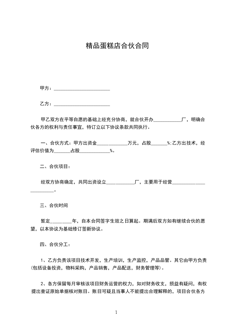 一、合伙方式:甲方出资金_____________万元,占股_______%;乙方出技术,经评估价值为_______占股_____________%。