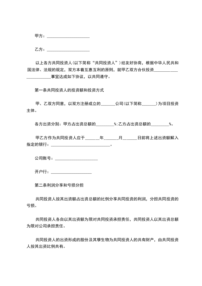 以上各方共同投资人(以下简称“共同投资人”)经友好协商,根据中华人民共和国法律、法规的规定,双方本着互惠互利的原则,就甲乙双方合伙投资________________________事宜达成如下协议,以共同遵守。