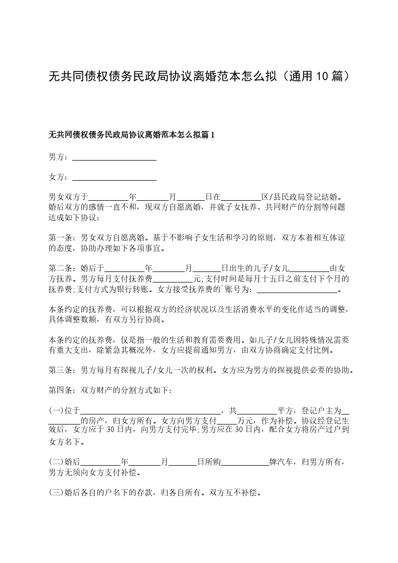 无共同债权债务民政局常用协议离婚范本怎么拟篇9