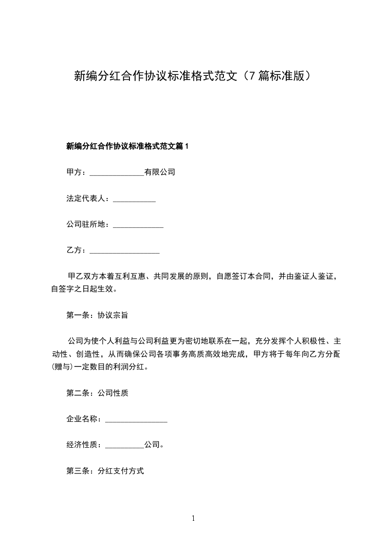 1、在公司经营活动中所得利润扣除各项开支,仍得以盈利的前提下,甲方从盈余中抽取___%的资金将对乙方予以分红。红利支付时间为每年的___月___日,以现金方式支付。