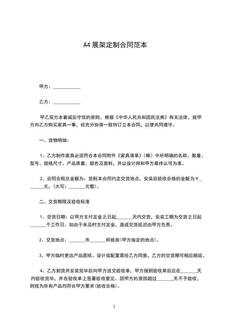 1、交货日期:以甲方支付定金之日起_______天内交货,安装工期为交货之日起_______个工作日。如由于未及时支付定金,造成交货延迟由甲方负责。