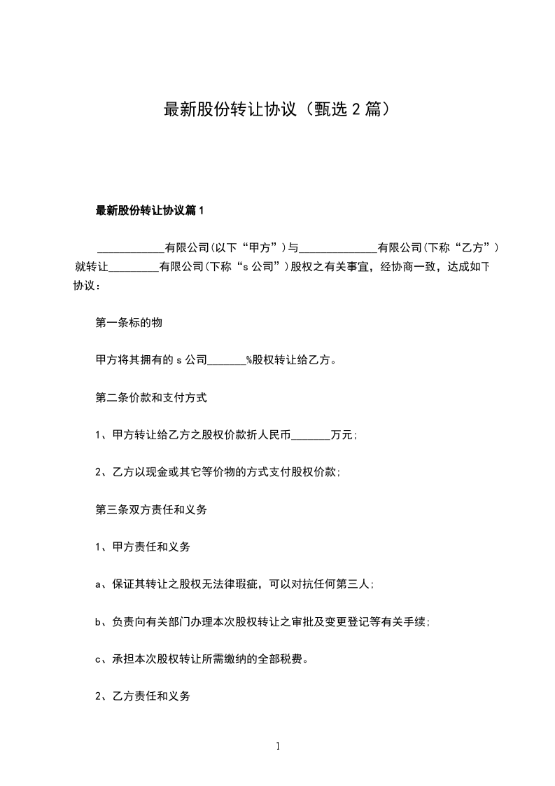 最新股份转让协议篇1