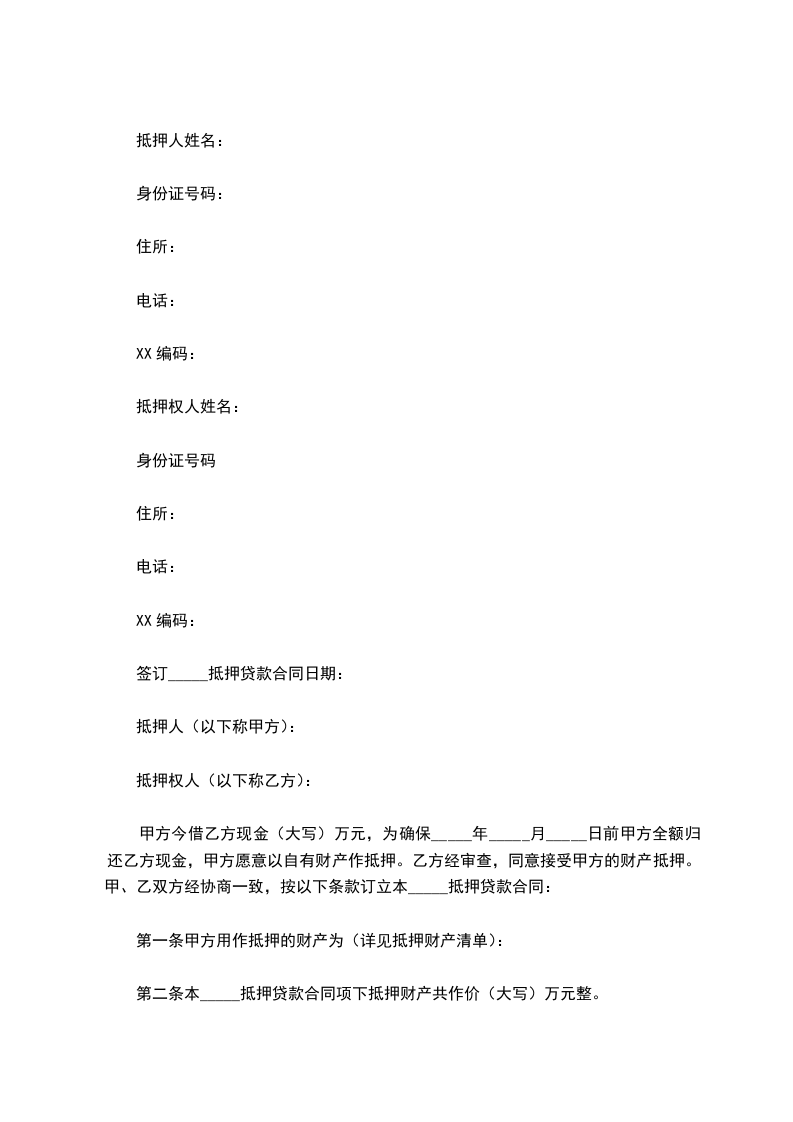 甲方今借乙方现金(大写)万元,为确保_____年_____月_____日前甲方全额归还乙方现金,甲方愿意以自有财产作抵押。乙方经审查,同意接受甲方的财产抵押。甲、乙双方经协商一致,按以下条款订立本_____抵押贷款合同: