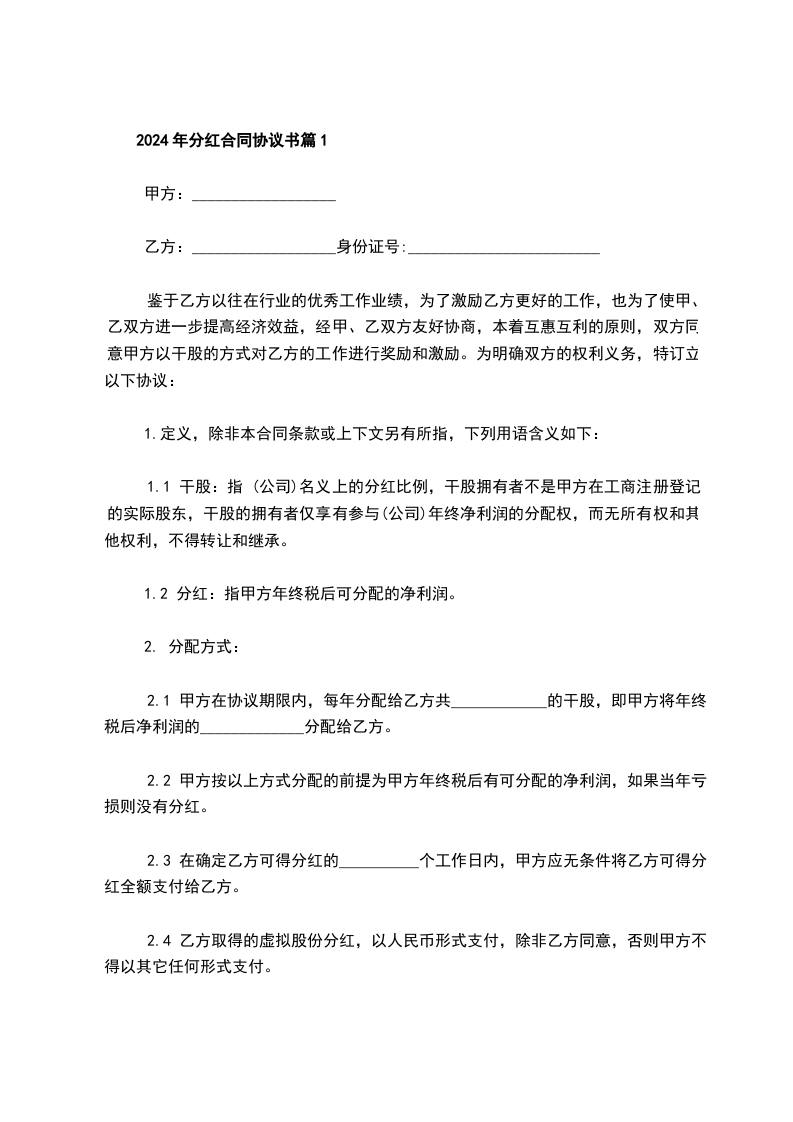 2、乙方所得红利比例为___%(以___税后可分配利润___为基准),通过___方式支付,并视公司的发展以书面形式每______年调整一次;