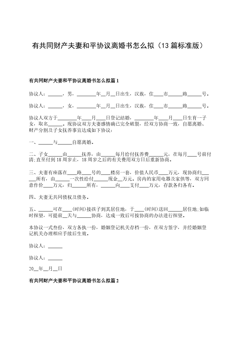 有共同财产夫妻和平协议离婚书怎么拟篇13