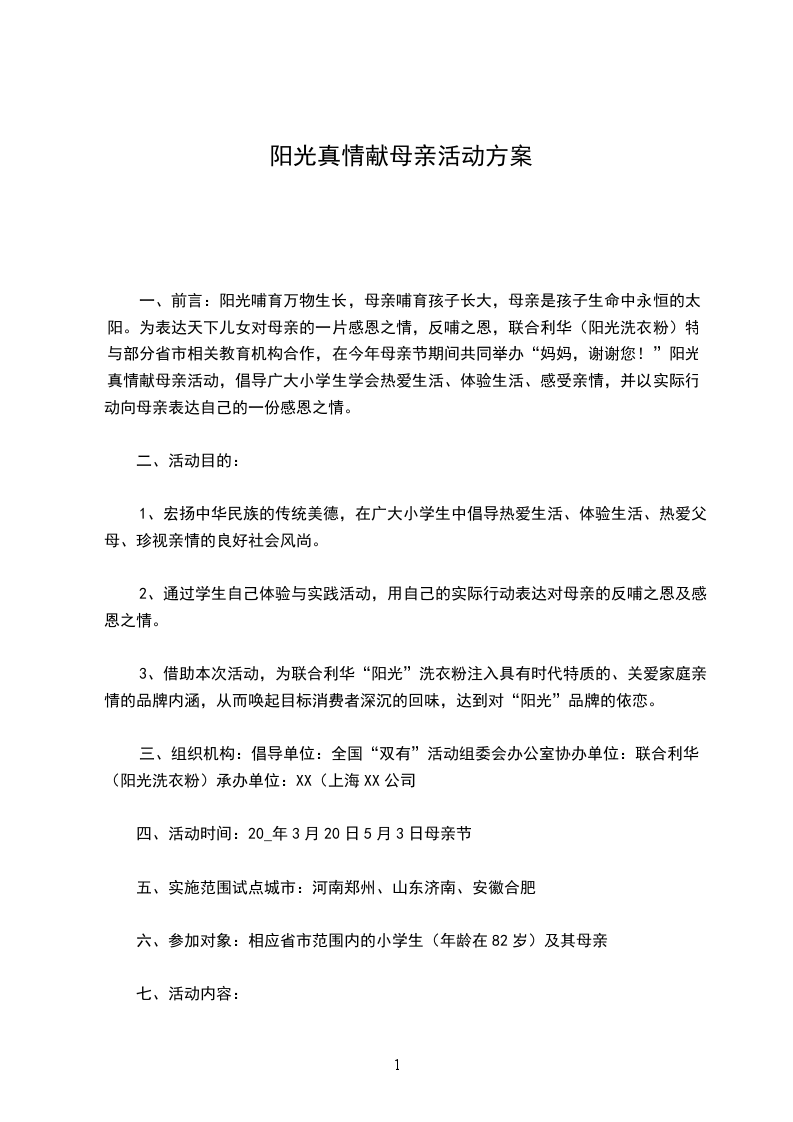 八、媒体表现平面媒体内容以及表现方式见附页设计稿,在此略过。报纸稿:略DM单页内容:略宣传页内容:略易拉宝内容:略酒店条幅内容:娘,谢谢您的养育之恩!电视稿:30秒画面一:一个婴儿抱着妈妈的脖子,发出第一个词语:妈妈。背景音乐:?世上只有妈妈好?画面二:一个两三岁的儿童跌倒,趴在地上哭着喊:妈妈。画面三:一个五六岁的儿童走向幼儿园,挥手辞别说:妈妈。画面三:一个八九岁的少年放学走出学校,跑过来说:妈妈。画面四:一个十八九岁的青年在火车上挥手辞别,喊道:妈妈。画面五:一个二十多岁的大学生身穿学士服,与妈妈相拥说道:妈妈。画面六:一个三十岁的男人身穿礼服,和穿婚纱的妻子一起说道:妈妈。画面七:一个四十多岁的男人坐在老板桌前,对着说道:妈妈。画面八:一张张母亲照片快速掠过:怀胎十月、深情哺育、公园玩耍、雨中打伞等等旁白:妈妈,我们学会的第一个音节;妈妈,伴随我们成长每一步画面九:“5月8日日历特写,突出页面上“母亲节三字。叠印大字幕:感恩母亲,母爱永恒。旁白:感恩母亲,母爱永恒。画面十:“邵阳XX主画面标版,叠印字幕:邵阳XX与您共度母亲节。画十一:动画字幕:敬请关注5月8日活动,详情见5月8日?内陆特区报?旁白:敬请关注5月8日活动,详情见5月8日?内陆特区报?。根据资料片的情况在?画面一?至?画面八?之间进行调整。短信内容:A:襁褓中你哭她笑,蹒跚中你跌倒她尖叫;病痛中你呻吟她哭泣,人生路上你成功她骄傲。B:宁可不长大,如果茁壮是以母亲的蹒跚为代价;宁可不长大,如果风华换来的是母亲的白发;宁可不长大,如果漂泊留给母亲无限的牵挂;宁可不长大,如果上帝能再还我们一个年轻的妈妈。C:感恩母亲,母爱永恒。5月8日,“