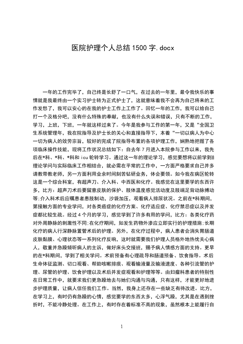 一年的工作完毕了,自己终是长舒了一口气,在过去的一年里,最令我快乐的事情就是我最终由一个实习护士转为正式护士了,这就意味着我不会再为自己将来的工作发愁了,我可以安心的在我的护士工作上工作了。回忆一年的工作,我可以给自己打一个及格分吧,没有什么特殊的奉献,也没有什么失误和错误,只有不断的工作,学习,上班,下班,一年就这样过来了。今年是我参与工作的第一年,又是“全国卫生系统管理年,我在院指导及护士长的关心和直接指导下,本着“一切以病人为中心,一切为病人的效劳宗旨,较好的完成了院指导布置的各项护理工作,娴熟地把握了各项临床操作技能,现将工作状况总结如下:自去年7月进入本院参与工作以来,我先后在*科、*科、*科和icu轮转学习。通过这一年的理论学习,感觉要想将以前学到的理论学问与实际临床工作相结合,就必需在平常的工作中,一方面严格要求自己并多请教带教老师,另一方面利用业余时间刻苦钻研业务,体会要领。如今我在病区轮转,这是一个综合科室,有超声刀、介入科、中西医和化疗。我感觉在这里要学的东西许多,比方:超声刀术后要留意皮肤的保护、肢体温度感觉活动度及肢端足背动脉搏动等;介入科术后应嘱患者患肢制动,沙袋加压,观看病人排尿状况。之前在*科期间,第接触方面的专业学问,对各类癌症的化疗方案、化疗适应症、化疗禁忌症以及并发症都比较生疏。经过4个月的学习,感觉学到了许多有用的学问,比方:各类化疗药对外周静脉的刺激性不同;在化疗期间,如发生药物外渗应立即实行的护理措施;长期化疗的病人行深静脉置管术后的护理。另外,在化疗过程中,病人患者会消失胃肠道、皮肤黏膜、心理状态等一系列化疗反响,这时就需要我们护理人员格外地热忱关心病人,敬重并急躁倾听病人的主诉,做好床头交接班,赐予病人情感方面的支持。更早的在*科期间,学到了相关学问。术前预备有心理疏导和肠道预备、饮食指导。术后生命体征监测、切口观看、帮助咳嗽排痰、观看输液量及输液速度、各种引流管的护理、尿管的护理、饮食护理以及术后并发症观看和护理等等。由妇瘤科患者的特别性,在日常工作中,就要求我们更急躁地去与她们沟通与沟通,只有这样,才能更好地进步护理质量,让病人信任我们工作。当然,我身上还存在一些缺乏有待改进。比方,在学习上,有时仍有急躁的心情,感觉要学的东西太多,心浮气躁,尤其是在遇到挫折时,不能冷静处理。在工作上,有时存在着标准不高的现象,虽然根本上能履行自己的职责和义务,但是在主动性方面还有待进一步进步,这都是我今后需要改进和进步的地方。在即将过去的一年里,要再次感谢院指导、护士长和带教老师赐予的训练、指导、批判和关心,感谢同事们赐予的关心和支持。回忆过去,有很多进步和进步,同时也存在一些缺乏;展望将来,应当发扬自身的优点与特长,抑制缺乏。通过近一年的学习,除熟识了各科室的业务学问外,我还很留意护士职业形象,在平常工作中留意文明礼貌效劳,坚持文明用语,工作时仪表端庄、着装干净、发不过肩、不浓妆艳抺、不穿高跟鞋、响底鞋、礼貌待患、态度和气、语言标准。仔细学习医疗事故处理条例及其法律法规,乐观参医院组织的医疗事故处理条例学习活动,丰富了法律学问,增加了平安保护意识。在护士长乐观仔细指导下,我在许多方面都有了长足的进步和进步,平常坚持参与科室每月一次的业务学习,每周二的晨会,坚持危重病人护理查房,护理人员四基训练,在护理部组织的2次技术操作考试中,均获得优异的成果。在一年的工作中,能始终坚持爱岗敬业,贯彻“以病人为中心,以质量为核心的效劳理念,进步了自身素养及应急力量。在将要迎来的一年中,我会在总结过去一年的得与失后,详细的将自己在将来一年要做的事情完好的想出来,在将来的一年中,我会本着护士的天职,乐观仔细努力的工作,把我要做的事情做到,在自己平凡的岗位上作出不平凡的业绩来。我会不断的进步自己的思想素养,将为人民效劳时刻记在心中,实现自己人格的升华!医院护理个人总结1500