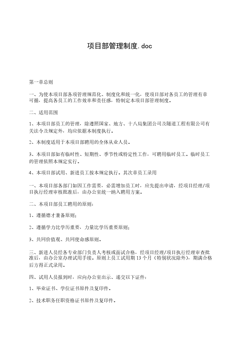 1、本项目部员工的管理,除遵照国家、地方、十八局集团公司及隧道工程有限公司有关法令及规定外,均应依据本制度执行。