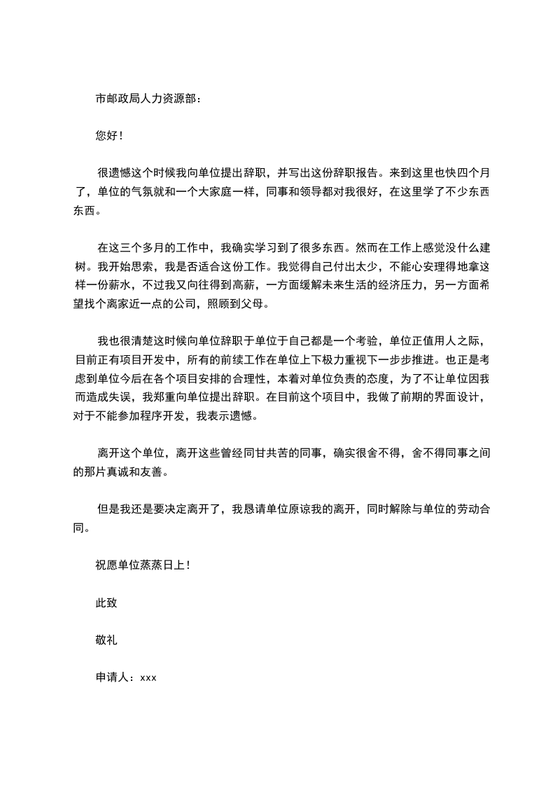 很遗憾这个时候我向单位提出辞职,并写出这份辞职报告。来到这里也快四个月了,单位的气氛就和一个大家庭一样,同事和领导都对我很好,在这里学了不少东西东西。