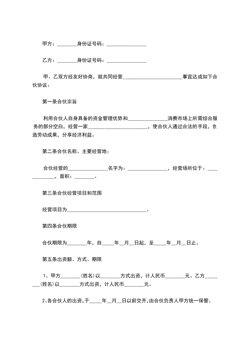 3、本合伙出资共计人民币________元。合伙期间各合伙人的出资为共有财产,不得随意请求分割,合伙终止后,各合伙人的出资仍为个人所有,协议终止当天或按合伙人约定的时间予以返还。