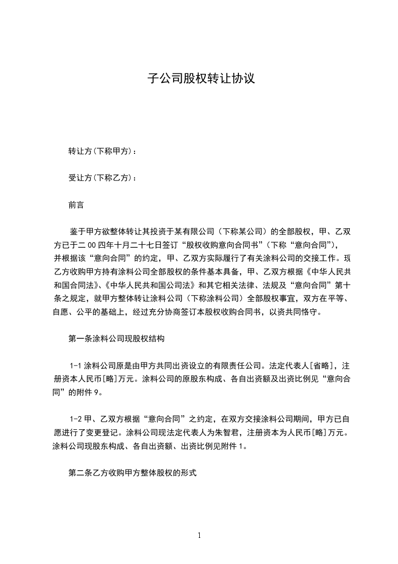鉴于甲方欲整体转让其投资于某有限公司(下称某公司)的全部股权,甲、乙双方已于二00四年十月二十七日签订“股权收购意向合同书”(下称“意向合同”),并根据该“意向合同”的约定,甲、乙双方实际履行了有关涂料公司的交接工作。现乙方收购甲方持有涂料公司全部股权的条件基本具备,甲、乙双方根据《中华人民共和国民法典》、《中华人民共和国公司法》和其它相关法律、法规及“意向合同”第十条之规定,就甲方整体转让涂料公司(下称涂料公司)全部股权事宜,双方在平等、自愿、公平的基础上,经过充分协商签订本股权收购合同书,以资共同恪守。