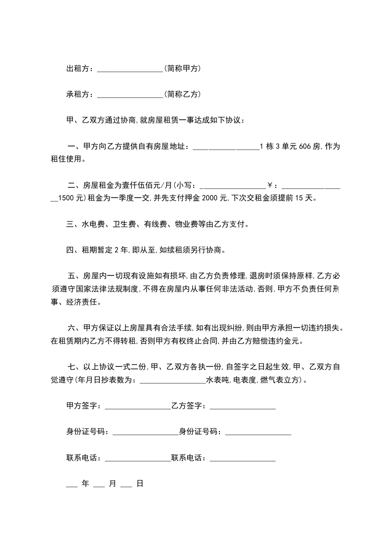 一、甲方向乙方提供自有房屋地址:_________________1栋3单元606房,作为租住使用。