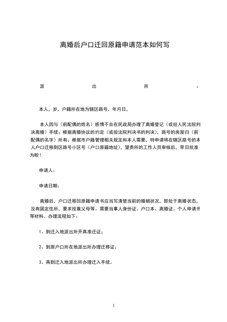 本人因与(前配偶的姓名)感情不合在民政局办理了离婚登记(或经人民法院判决离婚)手续;根据离婚协议的约定(或按法院判决书的判决),路号的房屋归(前配偶的名字)所有;根据市户籍管理相关规定和本人需要,特申请将在辖区路号的本人户口迁移到区路号小区号(户口原籍地址),望贵所的工作人员审核后,早日批准为盼!