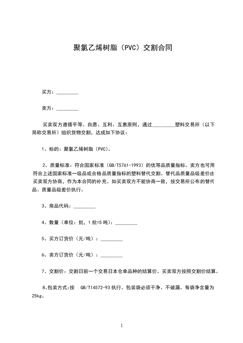 本交易所将在________年____月____日起上市交易符合国家标准GB/T5761-1993(PVC-5、PVC-7、PVC-3)优级品质量指标的聚氯乙烯(PVC)。现根据《广东塑料交易所交易管理办法(GB本)》,制定了《_________塑料交易所(PVC)交割合同》,现予发布,并于________年____月____日起实施,请遵照执行。