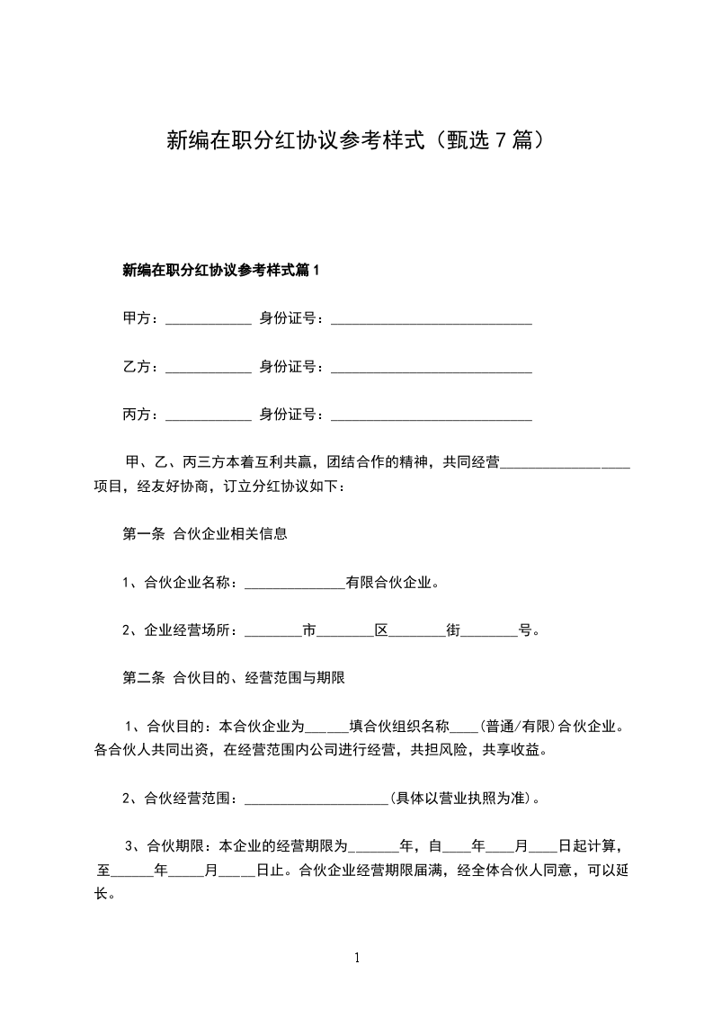 新编在职分红协议参考样式篇1