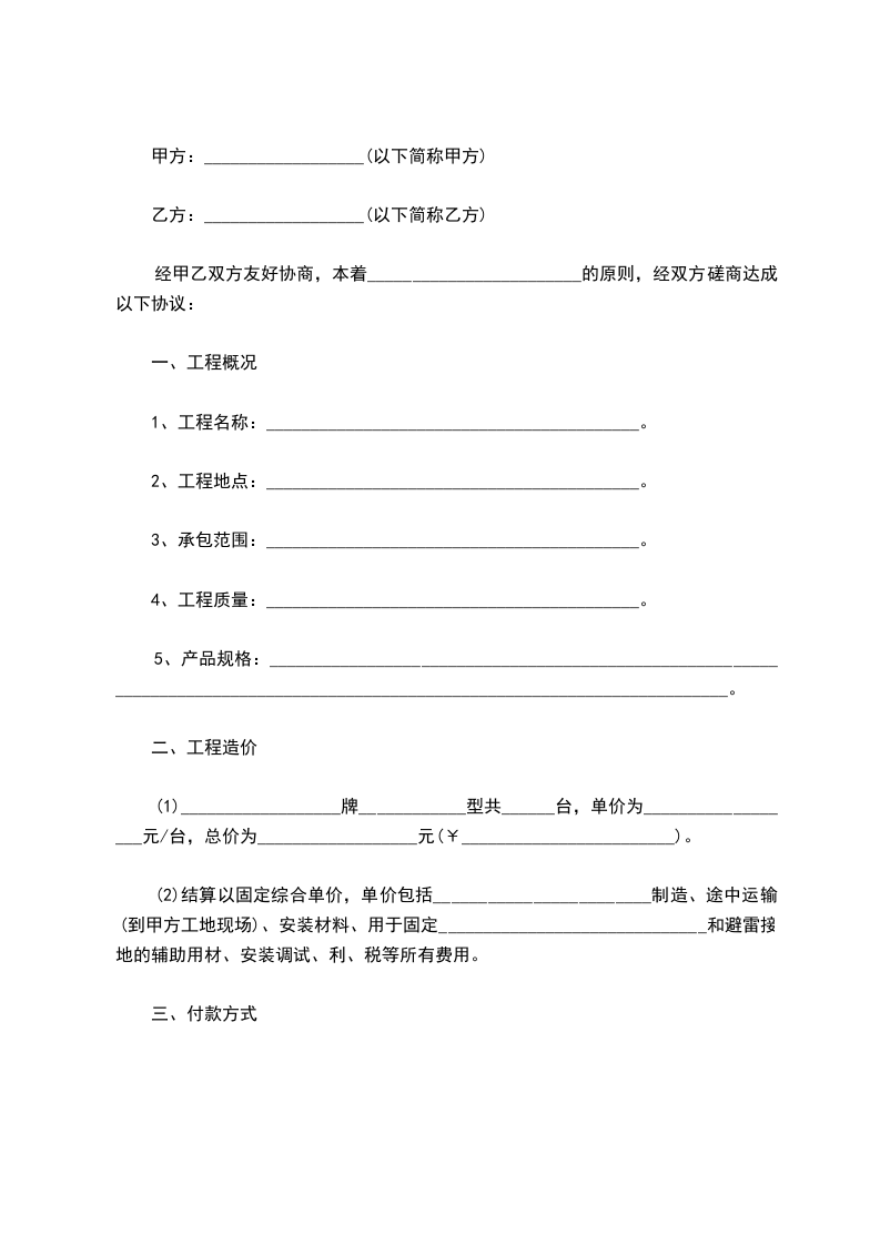 (2)结算以固定综合单价,单价包括________________________制造、途中运输(到甲方工地现场)、安装材料、用于固定______________________________和避雷接地的辅助用材、安装调试、利、税等所有费用。