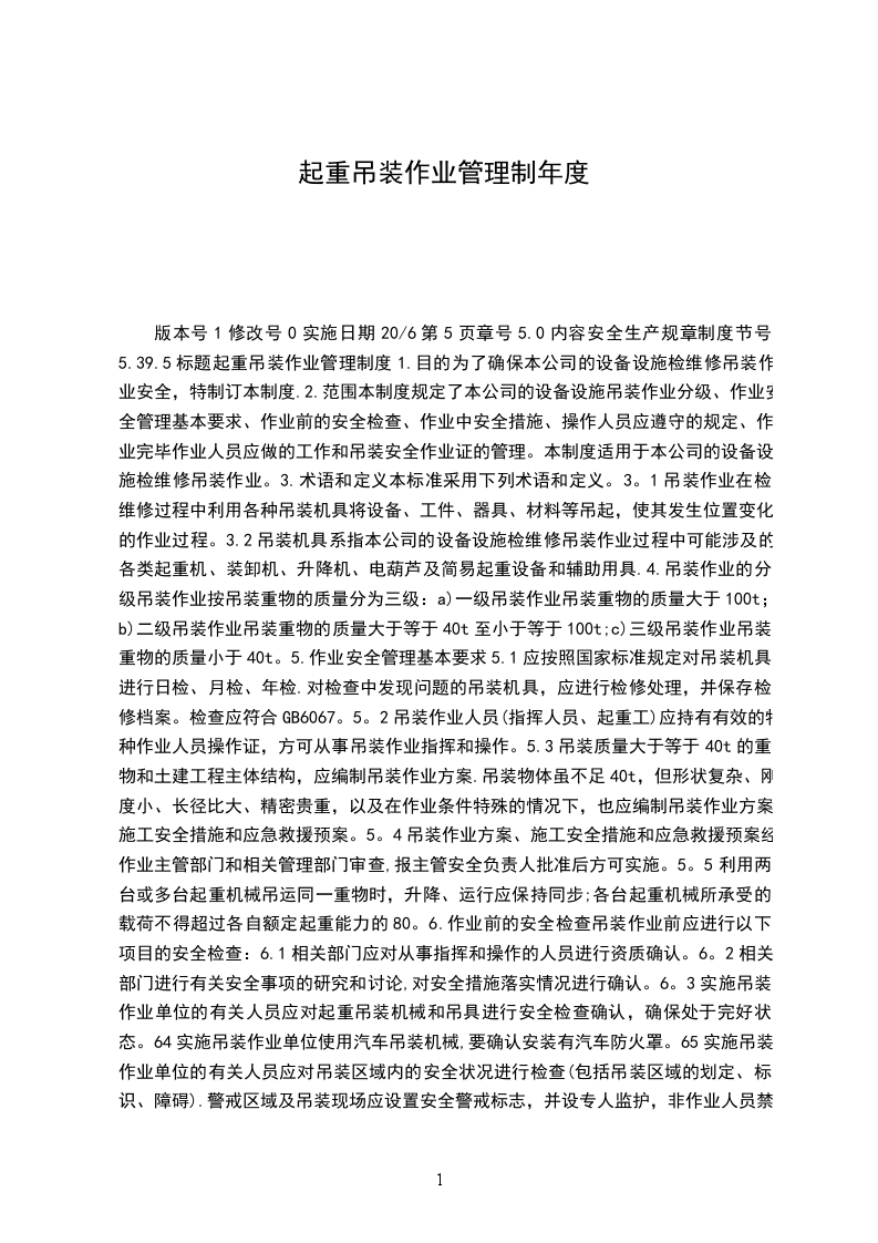 版本号1修改号0实施日期20/6第5页章号5.0内容安全生产规章制度节号5.39.5标题起重吊装作业管理制度1.目的为了确保本公司的设备设施检维修吊装作业安全,特制订本制度.2.范围本制度规定了本公司的设备设施吊装作业分级、作业安全管理基本要求、作业前的安全检查、作业中安全措施、操作人员应遵守的规定、作业完毕作业人员应做的工作和吊装安全作业证的管理。本制度适用于本公司的设备设施检维修吊装作业。3.术语和定义本标准采用下列术语和定义。3。1吊装作业在检维修过程中利用各种吊装机具将设备、工件、器具、材料等吊起,使其发生位置变化的作业过程。3.2吊装机具系指本公司的设备设施检维修吊装作业过程中可能涉及的各类起重机、装卸机、升降机、电葫芦及简易起重设备和辅助用具.4.吊装作业的分级吊装作业按吊装重物的质量分为三级:a)一级吊装作业吊装重物的质量大于100t;b)二级吊装作业吊装重物的质量大于等于40t至小于等于100t;c)三级吊装作业吊装重物的质量小于40t。5.作业安全管理基本要求5.1应按照国家标准规定对吊装机具进行日检、月检、年检.对检查中发现问题的吊装机具,应进行检修处理,并保存检修档案。检查应符合GB6067。5。2吊装作业人员(指挥人员、起重工)应持有有效的特种作业人员操作证,方可从事吊装作业指挥和操作。5.3吊装质量大于等于40t的重物和土建工程主体结构,应编制吊装作业方案.吊装物体虽不足40t,但形状复杂、刚度小、长径比大、精密贵重,以及在作业条件特殊的情况下,也应编制吊装作业方案、施工安全措施和应急救援预案。5。4吊装作业方案、施工安全措施和应急救援预案经作业主管部门和相关管理部门审查,报主管安全负责人批准后方可实施。5。5利用两台或多台起重机械吊运同一重物时,升降、运行应保持同步;各台起重机械所承受的载荷不得超过各自额定起重能力的80。6.作业前的安全检查吊装作业前应进行以下项目的安全检查:6.1相关部门应对从事指挥和操作的人员进行资质确认。6。2相关部门进行有关安全事项的研究和讨论,对安全措施落实情况进行确认。6。3实施吊装作业单位的有关人员应对起重吊装机械和吊具进行安全检查确认,确保处于完好状态。64实施吊装作业单位使用汽车吊装机械,要确认安装有汽车防火罩。65实施吊装作业单位的有关人员应对吊装区域内的安全状况进行检查(包括吊装区域的划定、标识、障碍).警戒区域及吊装现场应设置安全警戒标志,并设专人监护,非作业人员禁止入内.安全警戒标志应符合GB16179的规定.66实施吊装作业单位的有关人员应在施工现场核实天气情况。室外作业遇到大雪、暴雨、大雾及6级以上大风时,不应安排吊装作业.7.作业中安全措施7。1吊装作业时应明确指挥人员,指挥人员应佩戴明显的标志;应佩戴安全帽,安全帽应符合GB2811的规定。7。2应分工明确、坚守岗位,并按GB5082规定的联络信号,统一指挥。指挥人员按信号进行指挥,其他人员应清楚吊装方案和指挥信号。7。3正式起吊前应进行试吊,试吊中检查全部机具、地锚受力情况,发现问题应将工件放回地面,排除故障后重新试吊,确认一切正常,方可正式吊装。7。4严禁利用管道、管架、电杆、机电设备等作吊装锚点。未经有关部门审查核算,不得将建筑物、构筑物作为锚点。7。5吊装作业中,夜间应有足够的照明.室外作业遇到大雪、暴雨、大雾及6级以上大风时,应停止作业。7。6吊装过程中,出现故障,应立即向指挥者报告,没有指挥令,任何人不得擅自离开岗位.7。7起吊重物就位前,不许解开吊装索具。7.8利用两台或多台起重机械吊运同一重物时,升降、运行应保持同步;各台起重机械所承受地载荷不得超过各自额定起重能力的80%.8.操作人员应遵守的规定8.1按指挥人员所发出的指挥信号进行操作.对紧急停车信号,不论由何人发出,均应立即执行。8.2司索人员应听从指挥人员的指挥,并及时报告险情.8。3当起重臂吊钩或吊物8.4严禁起吊超负荷或重物质量不明和埋置物体;不得捆挂、起吊不明质量,与其他重物相连、埋在地下或与其他物体冻结在一起的重物。8.5在制动器、安全装置失灵、吊钩防松装置损坏、钢丝绳损伤达到报废标准等情况下严禁起吊操作。8.6应按规定负荷进行吊装,吊具、索具经计算选择使用,严禁超负荷运行。所吊重物接近或达到额定起重吊装能力时,应检查制动器,用低高度、短行程试吊后,再平稳吊起。8.7重物捆绑、紧固、吊挂不牢,吊挂不平衡而可能滑动,或斜拉重物,棱角吊物与钢丝绳之间没有衬垫时不得进行起吊。8。8不准用吊钩直接缠绕重物,不得将不同种类或不同规格的索具混在一起使用。8。9吊物捆绑应牢靠,吊点和吊物的中心应在同一垂直线上。8。10无法看清场地、无法看清吊物情况和指挥信号时,不得进行起吊。8.11起重机械及其臂架、吊具、辅具、钢丝绳、缆风绳和吊物不得靠近高低压输电线路。在输电线路近旁作业时,应按规定保持足够的安全距离,不能满足时,应停电后再进行起重作业。8。12停工和休息时,不得将吊物、吊笼、吊具和吊索吊在空中。8.13在起重机械工作时,不得对起重机械进行检查和维修;在有载荷的情况下,不得调整起升变幅机构的制动器。8.14下方吊物时,严禁自由下落(溜);不得利用极限位置限制器停车。8。15遇大雪、