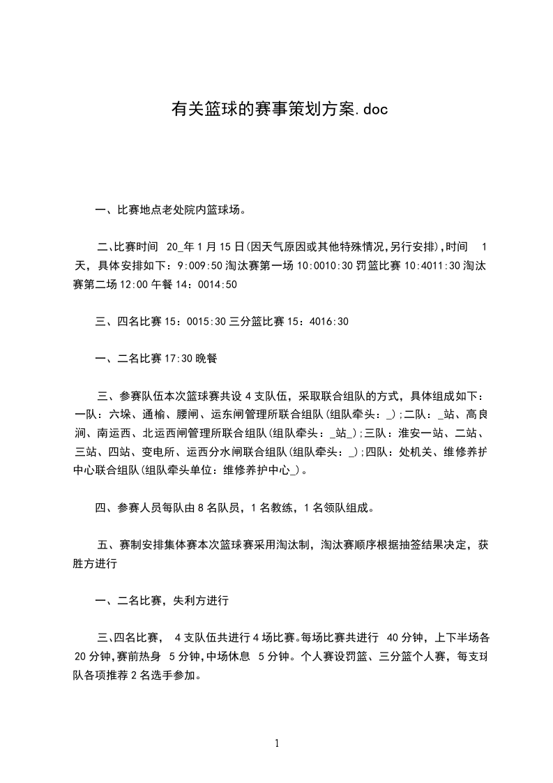 三、参赛队伍本次篮球赛共设4支队伍,采取联合组队的方式,具体组成如下:一队:六垛、通榆、腰闸、运东闸管理所联合组队(组队牵头:_);二队:_站、高良涧、南运西、北运西闸管理所联合组队(组队牵头:_站_);三队:淮安一站、二站、三站、四站、变电所、运西分水闸联合组队(组队牵头:_);四队:处机关、维修养护中心联合组队(组队牵头单位:维修养护中心_)。