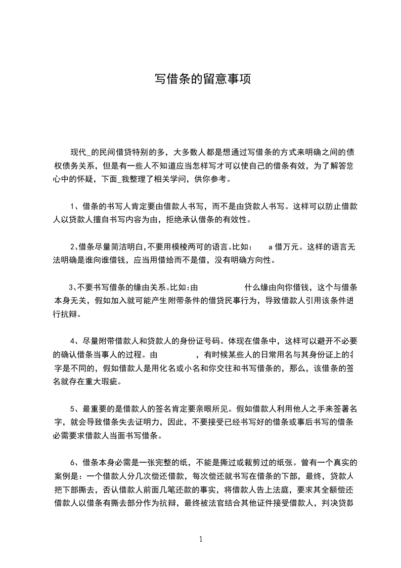 3、不要书写借条的缘由关系。比如:由 什么缘由向你借钱,这个与借条本身无关,假如加入就可能产生附带条件的借贷民事行为,导致借款人引用该条件进行抗辩。