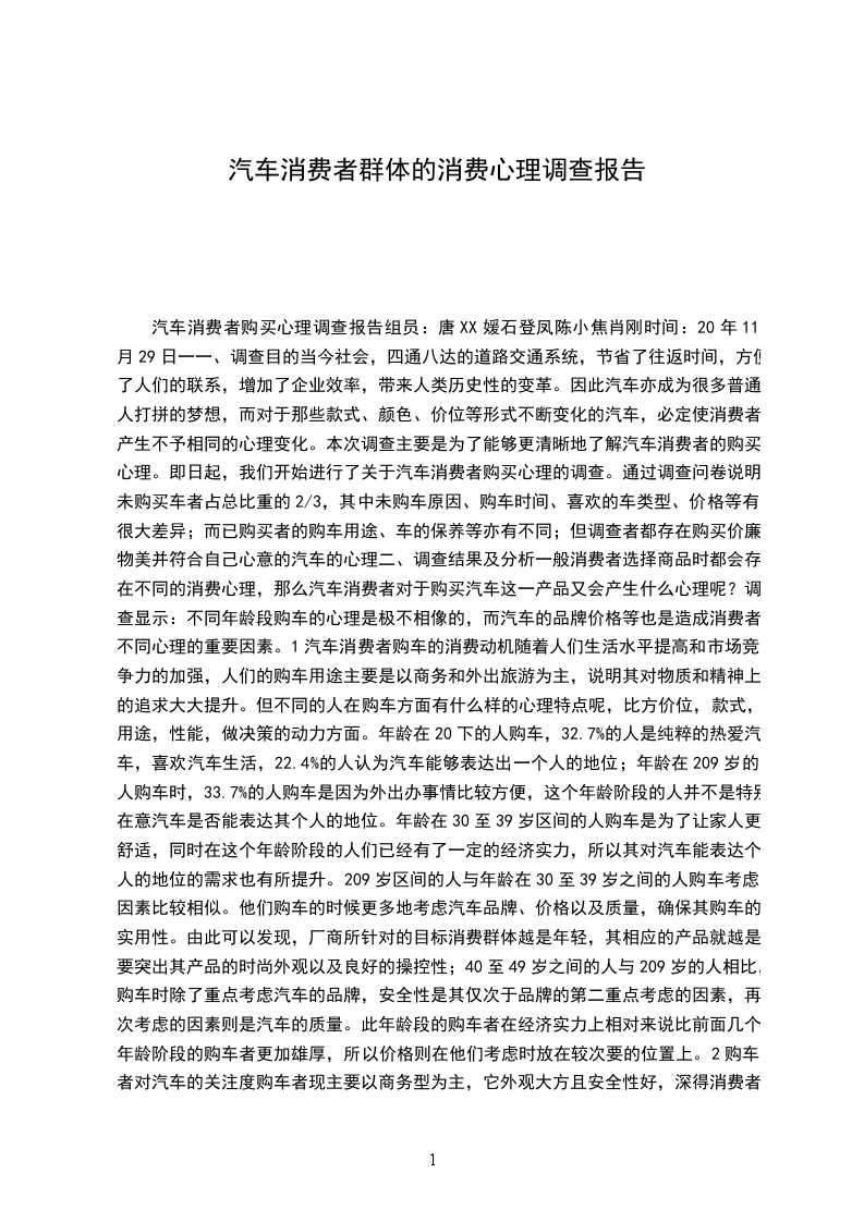 汽车消费者购买心理调查报告组员:唐XX媛石登凤陈小焦肖刚时间:20年11月29日一一、调查目的当今社会,四通八达的道路交通系统,节省了往返时间,方便了人们的联系,增加了企业效率,带来人类历史性的变革。因此汽车亦成为很多普通人打拼的梦想,而对于那些款式、颜色、价位等形式不断变化的汽车,必定使消费者产生不予相同的心理变化。本次调查主要是为了能够更清晰地了解汽车消费者的购买心理。即日起,我们开始进行了关于汽车消费者购买心理的调查。通过调查问卷说明:未购买车者占总比重的2/3,其中未购车原因、购车时间、喜欢的车类型、价格等有很大差异;而已购买者的购车用途、车的保养等亦有不同;但调查者都存在购买价廉物美并符合自己心意的汽车的心理二、调查结果及分析一般消费者选择商品时都会存在不同的消费心理,那么汽车消费者对于购买汽车这一产品又会产生什么心理呢?调查显示:不同年龄段购车的心理是极不相像的,而汽车的品牌价格等也是造成消费者不同心理的重要因素。1汽车消费者购车的消费动机随着人们生活水平提高和市场竞争力的加强,人们的购车用途主要是以商务和外出旅游为主,说明其对物质和精神上的追求大大提升。但不同的人在购车方面有什么样的心理特点呢,比方价位,款式,用途,性能,做决策的动力方面。年龄在20下的人购车,32.7%的人是纯粹的热爱汽车,喜欢汽车生活,22.4%的人认为汽车能够表达出一个人的地位;年龄在209岁的人购车时,33.7%的人购车是因为外出办事情比较方便,这个年龄阶段的人并不是特别在意汽车是否能表达其个人的地位。年龄在30至39岁区间的人购车是为了让家人更舒适,同时在这个年龄阶段的人们已经有了一定的经济实力,所以其对汽车能表达个人的地位的需求也有所提升。209岁区间的人与年龄在30至39岁之间的人购车考虑因素比较相似。他们购车的时候更多地考虑汽车品牌、价格以及质量,确保其购车的实用性。由此可以发现,厂商所针对的目标消费群体越是年轻,其相应的产品就越是要突出其产品的时尚外观以及良好的操控性;40至49岁之间的人与209岁的人相比,购车时除了重点考虑汽车的品牌,安全性是其仅次于品牌的第二重点考虑的因素,再次考虑的因素则是汽车的质量。此年龄段的购车者在经济实力上相对来说比前面几个年龄阶段的购车者更加雄厚,所以价格则在他们考虑时放在较次要的位置上。2购车者对汽车的关注度购车者现主要以商务型为主,它外观大方且安全性好,深得消费者喜爱;而运动型和动力强劲型相对来说比重较小,它们外观流线,帅气,有操控性,排量大,动力十足,适合年轻人使用。3消费者对4S店的评价4S店对于消费者来说是咨询,维修,解决难题的主要途径,因而,其的服务效果极为重要。4消费者未购买或更换的原因四、调查总结一、调查结果:汽车作为一个快速发展的行业已经得到越来越多的人们的关注,消费者的选择种类也越来越多,通过本次对汽车消费者心理的调查发现,人们主要还是比较关注汽车的品牌,档次,功能等,而大部分能接受的价位也是以中上为主。二、对商家的建议:1由于人们对于汽车的消费还存在着谨慎的态度,功能是消费者最为关心的因素,因而,解除消费者对产品的担忧和顾虑是目前的汽车行业需要重点解决的问题。