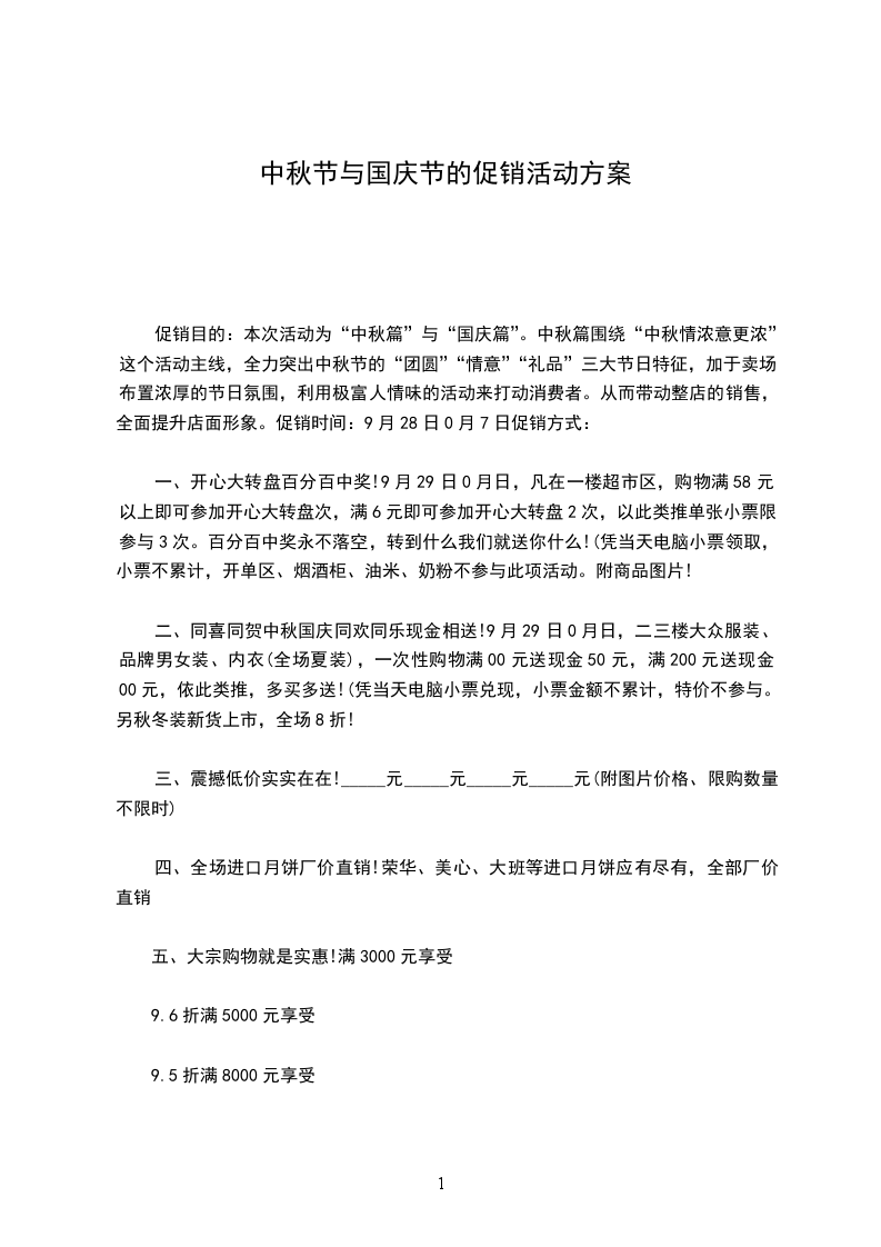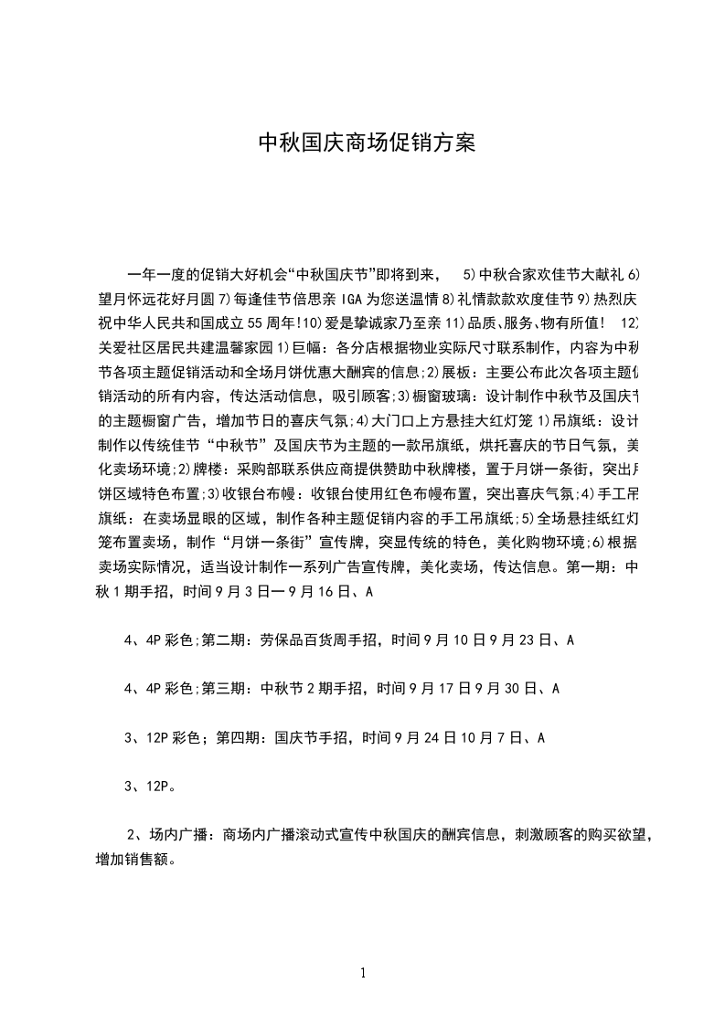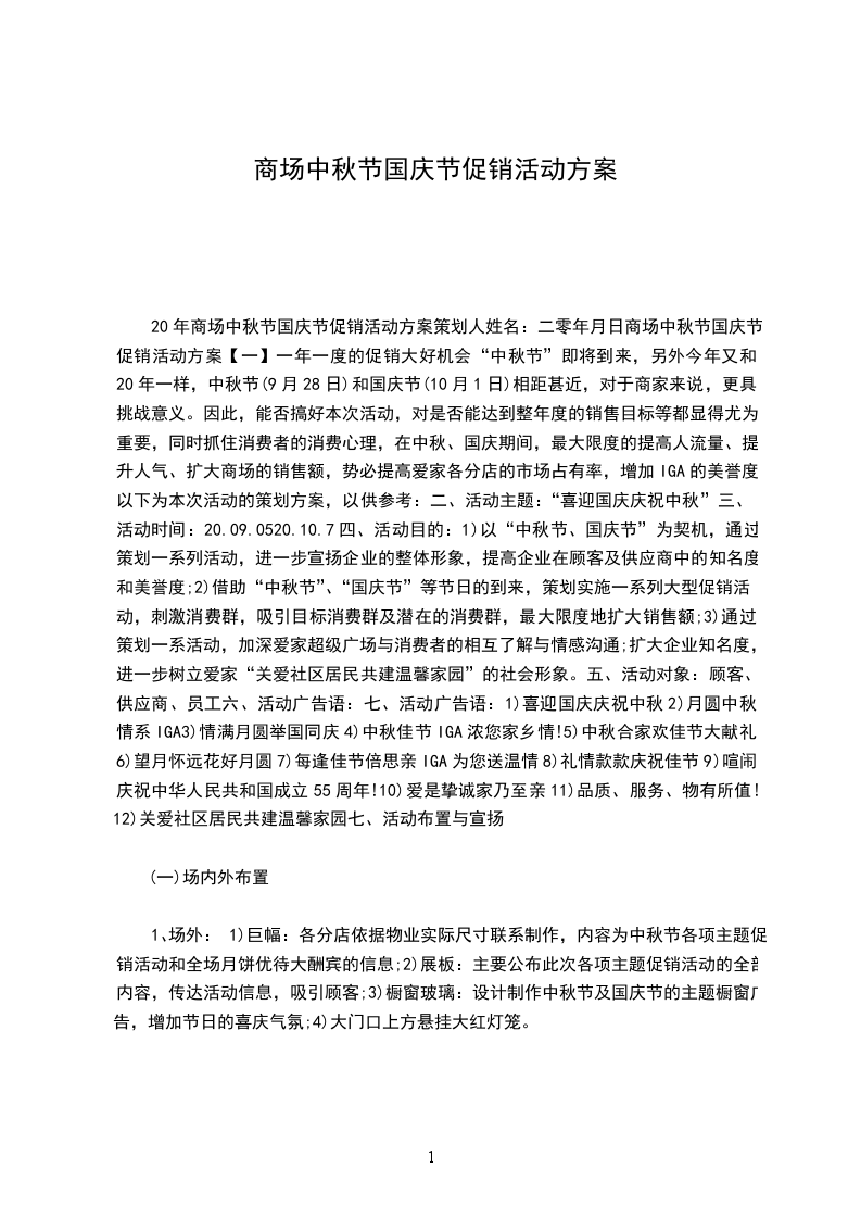 20年商场中秋节国庆节促销活动方案策划人姓名:二零年月日商场中秋节国庆节促销活动方案【一】一年一度的促销大好机会“中秋节”即将到来,另外今年又和20年一样,中秋节(9月28日)和国庆节(10月1日)相距甚近,对于商家来说,更具挑战意义。因此,能否搞好本次活动,对是否能达到整年度的销售目标等都显得尤为重要,同时抓住消费者的消费心理,在中秋、国庆期间,最大限度的提高人流量、提升人气、扩大商场的销售额,势必提高爱家各分店的市场占有率,增加IGA的美誉度。以下为本次活动的策划方案,以供参考:二、活动主题:“喜迎国庆庆祝中秋”三、活动时间:20.09.0520.10.7四、活动目的:1)以“中秋节、国庆节”为契机,通过策划一系列活动,进一步宣扬企业的整体形象,提高企业在顾客及供应商中的知名度和美誉度;2)借助“中秋节”、“国庆节”等节日的到来,策划实施一系列大型促销活动,刺激消费群,吸引目标消费群及潜在的消费群,最大限度地扩大销售额;3)通过策划一系活动,加深爱家超级广场与消费者的相互了解与情感沟通;扩大企业知名度,进一步树立爱家“关爱社区居民共建温馨家园”的社会形象。五、活动对象:顾客、供应商、员工六、活动广告语:七、活动广告语:1)喜迎国庆庆祝中秋2)月圆中秋情系IGA3)情满月圆举国同庆4)中秋佳节IGA浓您家乡情!5)中秋合家欢佳节大献礼6)望月怀远花好月圆7)每逢佳节倍思亲IGA为您送温情8)礼情款款庆祝佳节9)喧闹庆祝中华人民共和国成立55周年!10)爱是挚诚家乃至亲11)品质、服务、物有所值!12)关爱社区居民共建温馨家园七、活动布置与宣扬