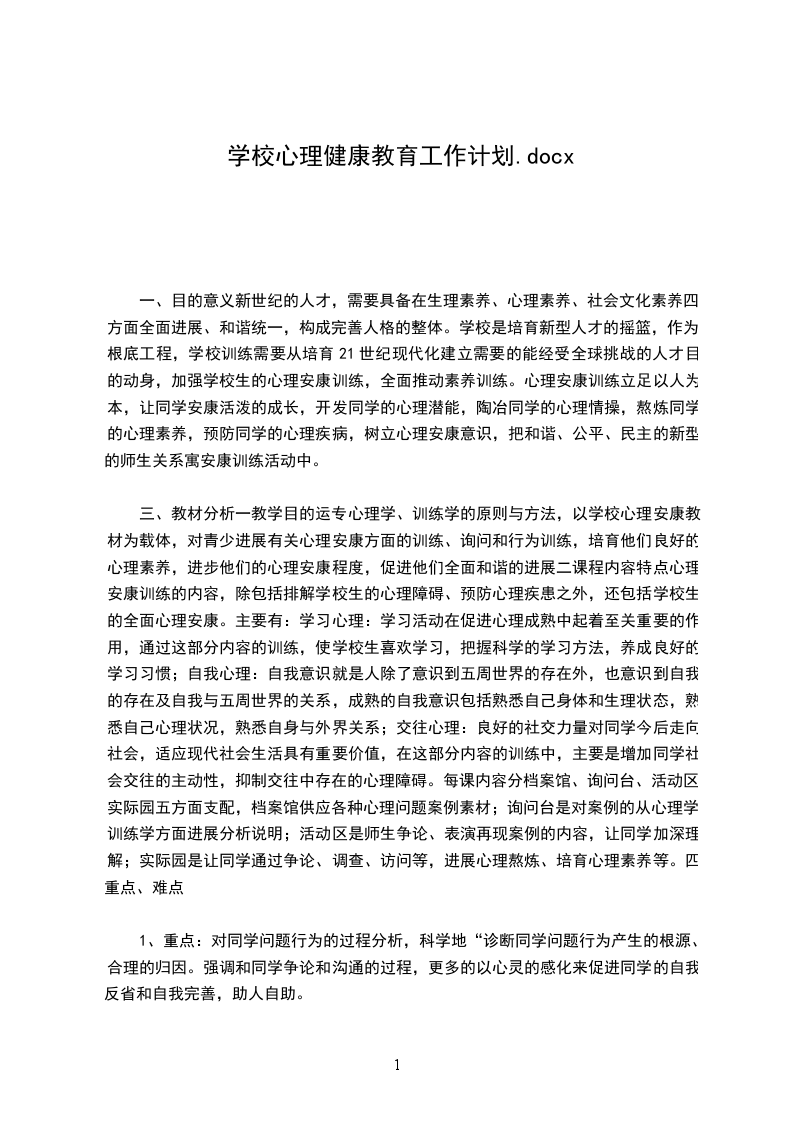 一、目的意义新世纪的人才,需要具备在生理素养、心理素养、社会文化素养四方面全面进展、和谐统一,构成完善人格的整体。学校是培育新型人才的摇篮,作为根底工程,学校训练需要从培育21世纪现代化建立需要的能经受全球挑战的人才目的动身,加强学校生的心理安康训练,全面推动素养训练。心理安康训练立足以人为本,让同学安康活泼的成长,开发同学的心理潜能,陶冶同学的心理情操,熬炼同学的心理素养,预防同学的心理疾病,树立心理安康意识,把和谐、公平、民主的新型的师生关系寓安康训练活动中。