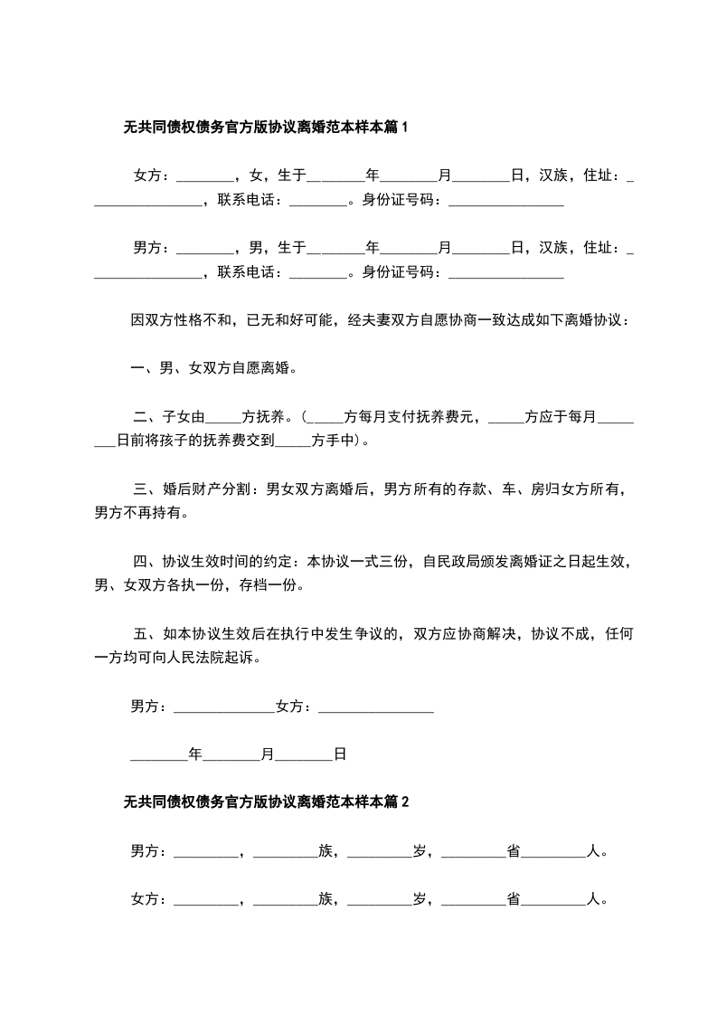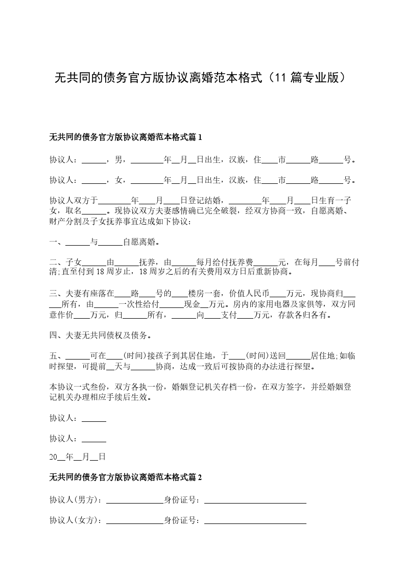无共同的债务官方版协议离婚范本格式篇11