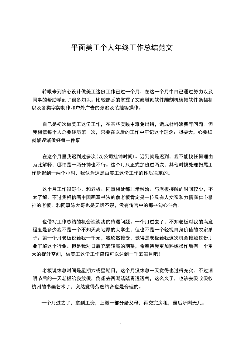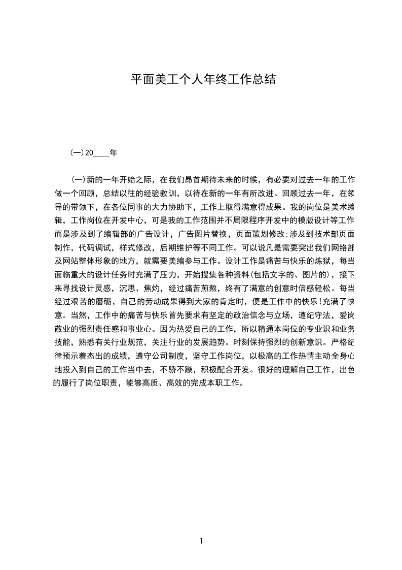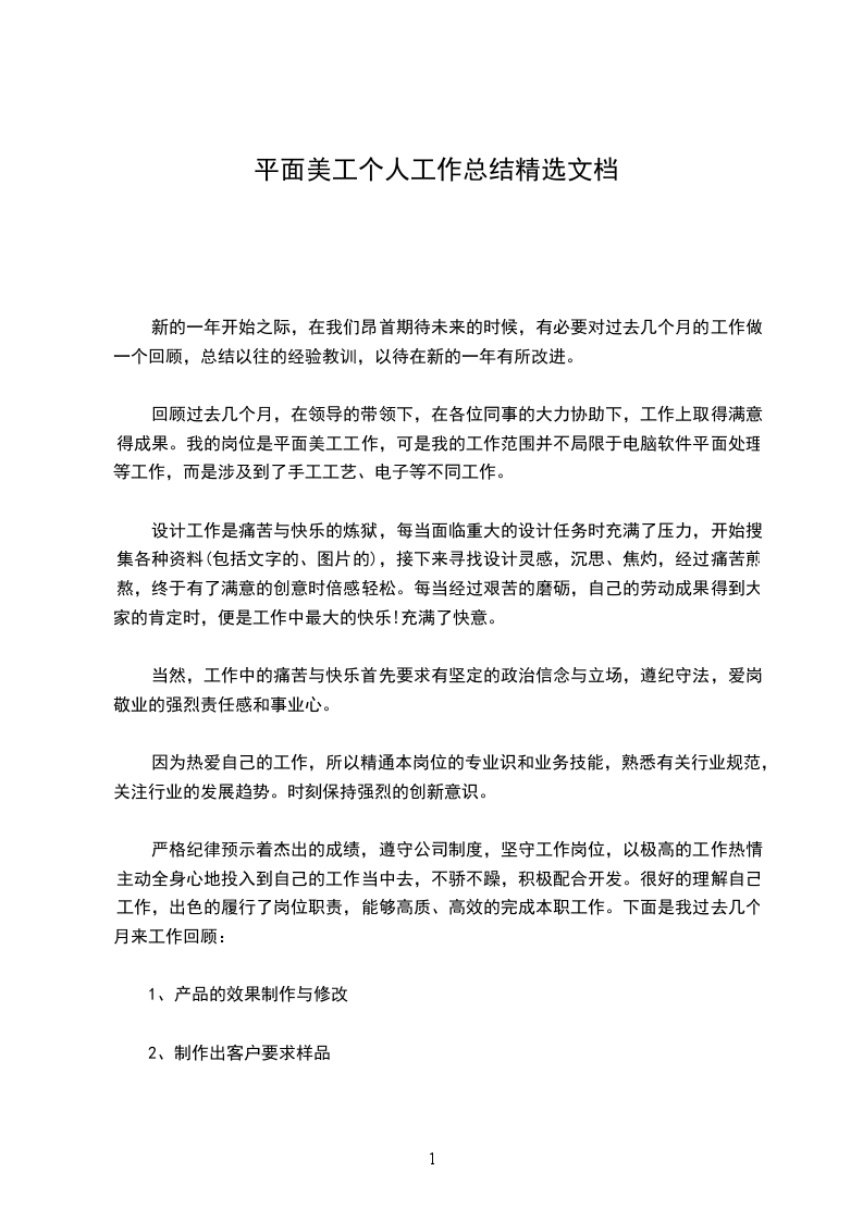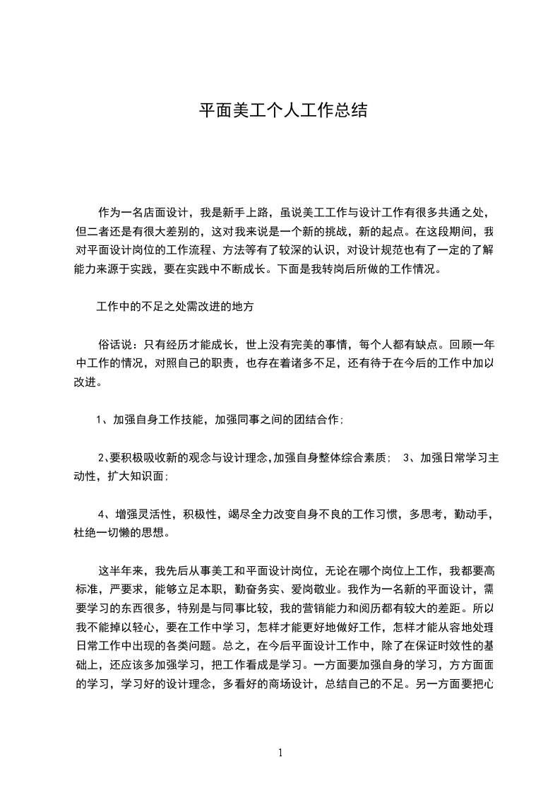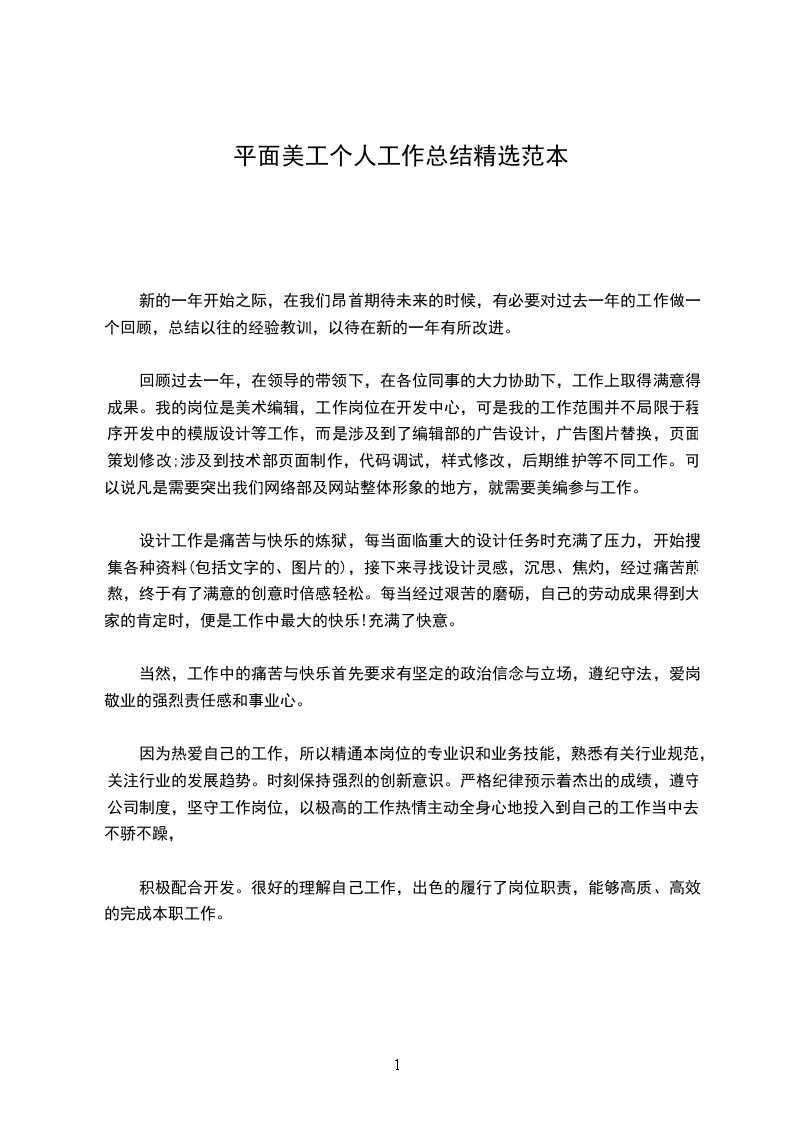 5、 x场商户活动页面设计开发 展望新的工作年度,盼望可以再接再砺,同时也需要再加强熬炼自身的设计程度和业务力量,在以后的工作中与同事多沟通,多讨论。多关心理解其他部门的工作性质,进一步进步自己专业学问技能,乐观汲取新的观念与设计理念,要连续在自己的工作岗位上兢兢业业做事,踏踏实实做人,争取做出更大的成果来,为公司带来更大的效益! 平面美工个人工作总结范文9 新的一年开头之际,在我们仰头期盼将来的时候,有必要对过去一年的工作做一个回忆,总结以往的阅历教训,以待在新的一年有所改良。