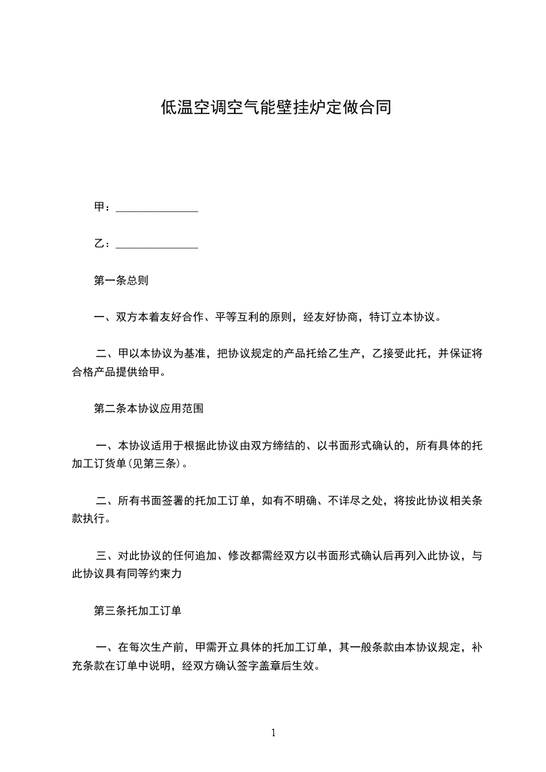 一、在每次生产前,甲需开立具体的托加工订单,其一般条款由本协议规定,补充条款在订单中说明,经双方确认签字盖章后生效。