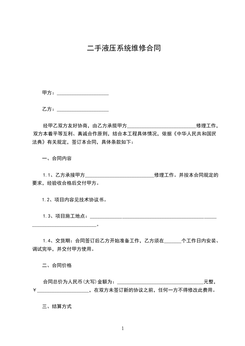 经甲乙双方友好协商,由乙方承揽甲方____________________________修理工作,双方本着平等互利、真诚合作原则,结合本工程具体情况,依据《中华人民共和国民法典》有关规定,签订本合同,具体条款如下:
