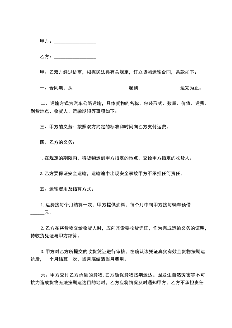 三、付款办法:乙方给甲方每运输满________________元钱的材料和运费,甲方按百分之五十当场结算清楚。
