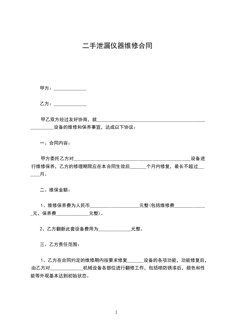 1、乙方在合同约定的维修期内按要求修复_______设备的各项功能,功能修复后,由乙方对______________机械设备各部位进行翻修工作,包括喷防锈漆后,颜色和性能等外观基本达到初始状态。