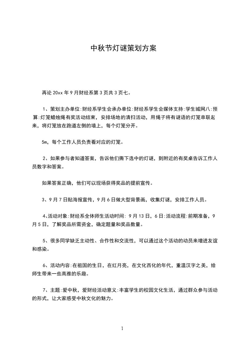 1、策划主办单位:财经系学生会承办单位:财经系学生会媒体支持:学生城网八:预算:灯笼蜡烛绳有奖活动结束,安排场地的清扫活动,用绳子将有谜语的灯笼串联起来,将灯笼放在跑道左侧的墙上,每个灯笼分开。