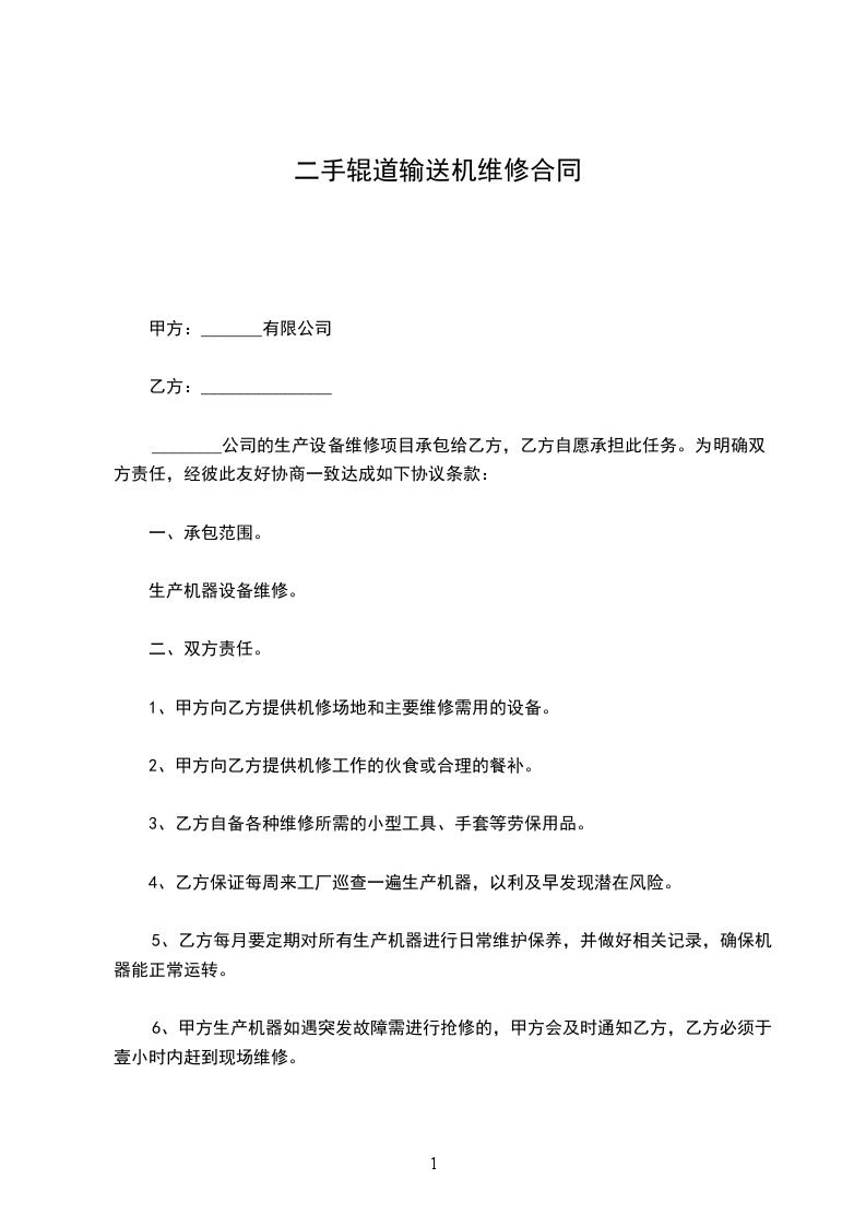 ________公司的生产设备维修项目承包给乙方,乙方自愿承担此任务。为明确双方责任,经彼此友好协商一致达成如下协议条款: